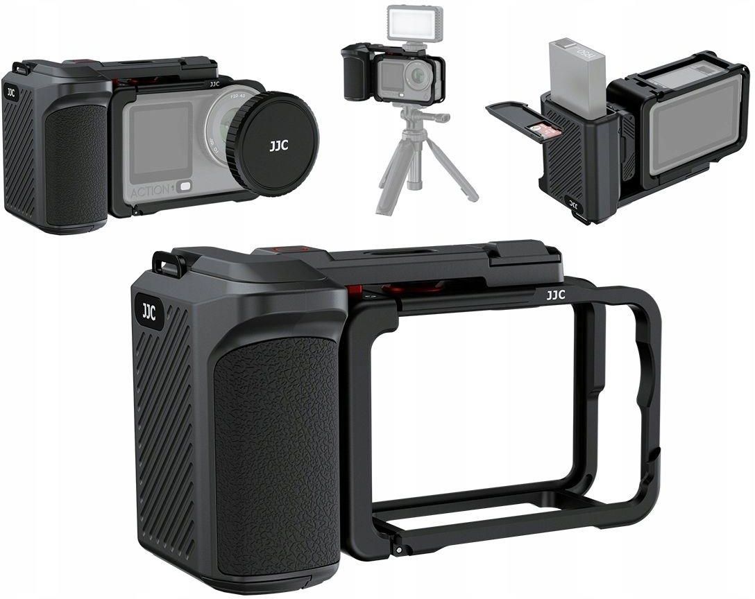 Profesjonalny uchwyt z ramką montażową ? Zestaw 2 w 1 – Grip + Ramka (Camera Cage) ? Dedykowany do DJI Osmo Action 6 Zestaw łączy ochronę kamery, wygodę fotografowania i filmowania oraz możliwość rozbudowy o akcesoria, dzięki czemu DJI Osmo Action 6 obsługuje się jak klasyczny aparat lub kompaktową kamerę wideo. Aluminiowa ramka ochronna → chroni kamerę przed uszkodzeniami Ergonomiczny grip ABS z silikonowym wykończeniem → pewniejszy chwyt i stabilniejsze ujęcia jak z aparatu Adapter spustu migawki → szybsze i wygodniejsze nagrywanie jedną ręką Grip z ramką łączy się poprzez magnetyczną szybkozłączkę → szybki i stabilny montaż oraz demontaż uchwytu bez użycia narzędzi Wbudowany schowek w gripie → na zapasową baterię i kartę microSD Dwie stopki ISO (cold shoe) → jedna znajduje się na ramce, druga na adapterze spustu migawki, co pozwala zamontować np. mikrofon i lampę LED Boczny gwint 1/4" w ramce → łatwy montaż na statywie, także do nagrań pionowych Otwór na smycz / pasek → bezpieczne użytkowanie w terenie i w ruchu Pełny dostęp do przycisków i portów → obsługa kamery bez zdejmowania ramki ? W zestawie: pasek na nadgarstek + osłona obiektywu → bezpieczne użytkowanie kamery i ochrona obiektywu podczas transportu Marka: JJC Model: TSFMS22-01 / SKU: S6-FMS-22-TDJ / Camera Grip Holder Ser Zestaw 2 w 1 – Grip + Ramka Ramka może być używana samodzielnie lub z gripem – idealna do zdjęć z ręki i montażu na statywie. Aluminiowa ramka ochronna / Camera Cage Precyzyjnie dopasowana ramka (camera cage) do DJI Osmo Action 6 stabilnie zabezpiecza kamerę przed uszkodzeniami mechanicznymi. Konstrukcja ramki została zaprojektowana tak, aby kamera była gotowa do pracy w każdej chwili – bez konieczności demontażu podczas ładowania, wymiany baterii czy karty pamięci. Ramka oferuje m.in. Stopkę ISO (cold shoe) – montaż mikrofonu lub lampy Gwint 1/4" – do zamocowania na statywie / do nagrań w pionie (Reels, Shorts, TikTok) Magnetyczne mocowanie quick-release – szybkie przypinanie akcesoriów Otwór na smycz / pasek – większe bezpieczeństwo w terenie Ergonomiczny uchwyt (Grip) z magazynem Uchwyt zaprojektowano z myślą o dłuższych sesjach nagraniowych – jego ergonomiczny kształt zmniejsza zmęczenie dłoni i ułatwia kontrolę nad kamerą podczas filmowania z ręki, w ruchu i w terenie. Wbudowany schowek na baterię i kartę microSD Uchwyt został wyposażony w praktyczny schowek, który pozwala bezpiecznie przechowywać 1 zapasową baterię oraz 1 kartę microSD. Spust migawki i rozbudowa o akcesoria Zestaw został wyposażony w adapter przycisku migawki, montowany w górnej zimnej stopce ramki. Rozwiązanie to umożliwia stabilne sterowanie kamerą jedną ręką. Adapter posiada regulowany punkt styku, co pozwala precyzyjnie dopasować go do położenia przycisku kamery. Dodatkowo, na jego górze znajduje się kolejna stopka typu ISO, umożliwiająca montaż akcesoriów takich jak lampa led czy mikrofon. Specyfikacja techniczna Kompatybilność: DJI Osmo Action 6 Wymiary Grip (uchwyt): 67,3 × 59,5 × 38,5 mm Ramka (Camera Cage): 82,5 × 58,5 × 31,5 mm Adapter migawki: 73,66 × 19,94 × 13,80 mm Materiały wykonania Stop aluminium ABS Silikon Pianka EVA Zawartość zestawu Ramka ochronna Uchwyt ręczny - Grip Adapter przycisku migawki Osłona obiektywu Smycze na nadgarstek Linka zabezpieczająca osłonę Klucz imbusowy Uwaga! Monopody, kamery, lampy i inne akcesoria dodatkowe przedstawione na zdjęciach pełnią jedynie rolę podglądową i nie są przedmiotem sprzedaży.