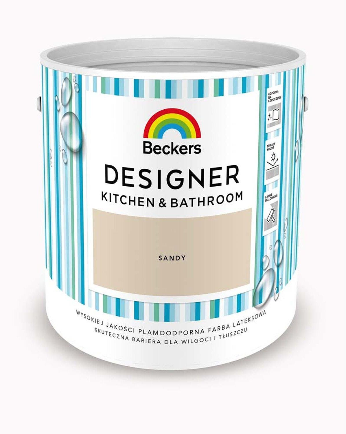 Beckers Designer Kitchen & Bathroom 2,5L Sandy Farba do pomieszczeń wilgotnych typu kuchnia, łazienka, pralnia, korytarz, pomieszczenia gospodarcze BECKERS DESIGNER KITCHEN & BATHROOM to wysokiej jakości, wodorozcieńczalna farba lateksowa, szczególnie polecana do stosowania w …