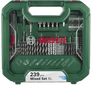 Zestaw mieszany XL marki Bosch, do wiercenia i wkręcania, zapakowany w walizce z tworzywa sztucznego. Zestaw akcesoriów przeznaczona do wiercenia i wkręcania w metalu, drewnie i betonie. Dodatkowo zestaw imbusów i narzędzi ręcznych. 239 sztuk.
