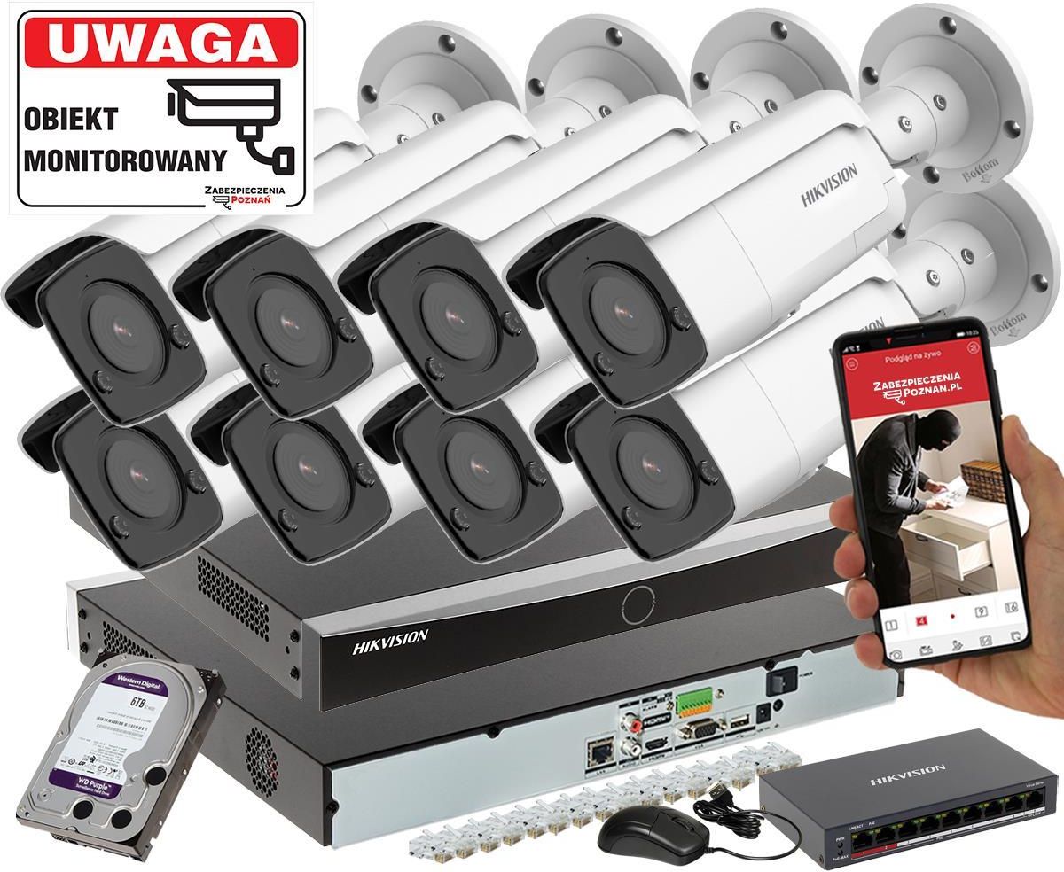 Zestaw monitoringu zawiera: 8x Kamera IP Hikvision DS-2CD2346G2-I(2.8MM)(C) ACUSENSE, 1x Rejestrator IP Hikvision DS-7608NXI-K2 ACUSENSE na 8 kamer IP 12 Mpx, 1x Switch PoE DS-3E0310HP-E 8-PORTOWY, 1x Dysk do monitoringu HDD-WD84PURZ 8TB 24/7 WESTERN DIGITAL, 18x wtyk RJ-45