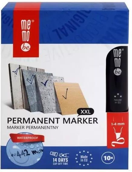 Opakowanie zbiorcze 10 sztuk. Marker permanentny MemoBe z tuszem w kolorze zielonym i ściętą końcówką w rozmiarze 1-4 mm. Przeznaczony do trwałego znakowania prawie wszystkich powierzchni, jak np.: kartonu, szkła, metalu, plastiku, drewna itd. Wodoodporny i szybkoschnący tusz o słabym zapachu. Może być pozostawiony bez skuwki do 14 dni (ISO 554). Obudowa markera wykonana w 30% z tworzyw z recyklingu. Wyposażony w wentylowaną skuwką zgodną z normą ISO 11540:1993. Dostępny w 4 kolorach: czarnym, zielonym, czerwonym i niebieskim. Wyprodukowany w Europie. Dostarczany w opakowaniu 10 szt. Wymiary: 132x95 mm Opakowanie: pudełko