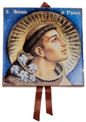 Ozdobna płytka ceramiczna z obrazem św. Antoniego z Padwy. Płytka ceramiczna o wymiarach 10 x 10 cm ze wstążeczką, w pudełku kartonowym z okienkiem. Wyprodukowana w Asyżu we Włoszech. Podmiot odpowiedzialny: Bratni Zew Sp. z o. o. Żółkiewskiego 14 31-539 Kraków Kraj pochodzenia: Włochy