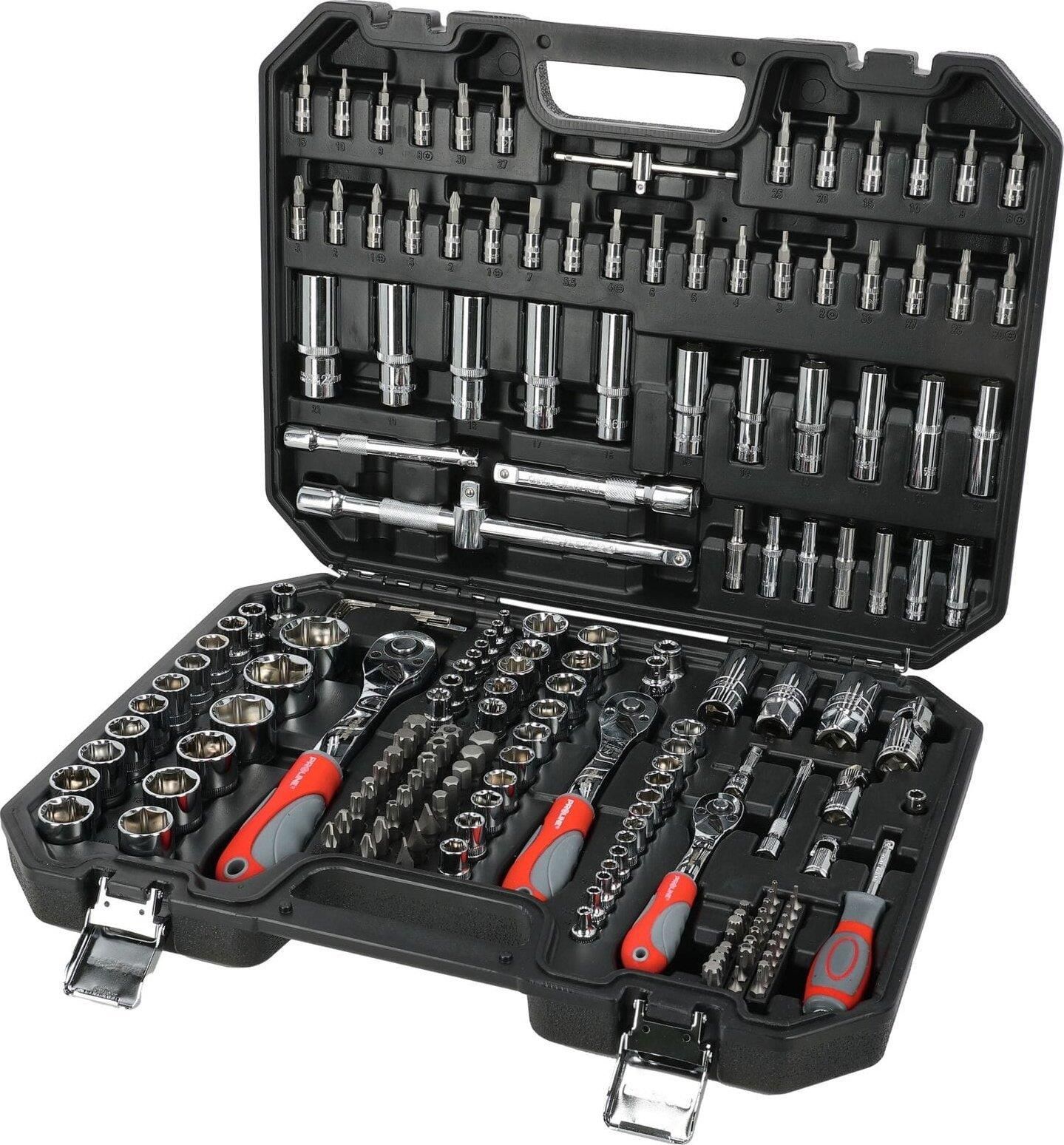 ZESTAW 179 SZT., 1/4", 3/8", 1/2" KWADRAT, 4-32 MM PROLINE 58179 Zestaw kluczy nasadowych 179 szt 1/2 3/8 1/4 cala kwadrat 4-32mm Proline 58179 Profesjonalny zestaw kluczy nasadowych Proline 58179 to niezawodne narzędzie dla każdego, kto szuka wszechstronnych i trwałych narzędzi do swojego warsztatu. Zestaw obejmuje 179 elementów, w tym nasadki w trzech rozmiarach (1/2”, 3/8”, 1/4”), co czyni go idealnym wyborem zarówno dla profesjonalistów, jak i amatorów. Zawartość zestawu Nasadki 1/2” Rozmiary: 10, 11, 12, 13, 14, 15, 16, 17, 18, 19, 20, 21, 22, 24, 27, 30, 32 mm Dodatkowe nasadki: 16, 17, 18, 19, 22 mm Nasadki TORX: E20, E24 Przedłużki: 125 mm, 250 mm Mechanizm grzechotki: 72 zęby (72T) Nasadki 3/8” Rozmiary: 10, 11, 12, 13, 14, 15, 16, 17, 18, 19 mm Nasadki TORX: E10, E11, E12, E14, E16, E18 Przedłużka: 125 mm Mechanizm grzechotki: 72 zęby (72T) Nasadki 1/4” Rozmiary: 4, 4.5, 5, 5.5, 6, 7, 8, 9, 10, 11, 12, 13, 14 mm Nasadki TORX: E4, E5, E6, E7, E8 Przedłużki: 50 mm, 100 mm Mechanizm grzechotki: 72 zęby (72T) Dodatkowe bity i nasadki Nasadki PH, PZ, TORX, HEX oraz bity do śrub imbusowych i inne. Nasadki radełkowane dla lepszego chwytu. Cechy produktu Materiał: Wykonane ze stali chromowo-wanadowej (CrV) zapewniającej długą żywotność i odporność na uszkodzenia. Wykończenie: Chromowane i polerowane nasadki, odporne na korozję, co ułatwia ich utrzymanie w czystości. Kuferek: Zestaw dostarczany jest w wytrzymałym kufrze z tworzywa sztucznego z metalowymi klamrami i systemem szybkiego montażu i demontażu zawiasów. Dzięki temu zestaw można przechowywać w formie tac narzędziowych, np. w szufladach warsztatowych.