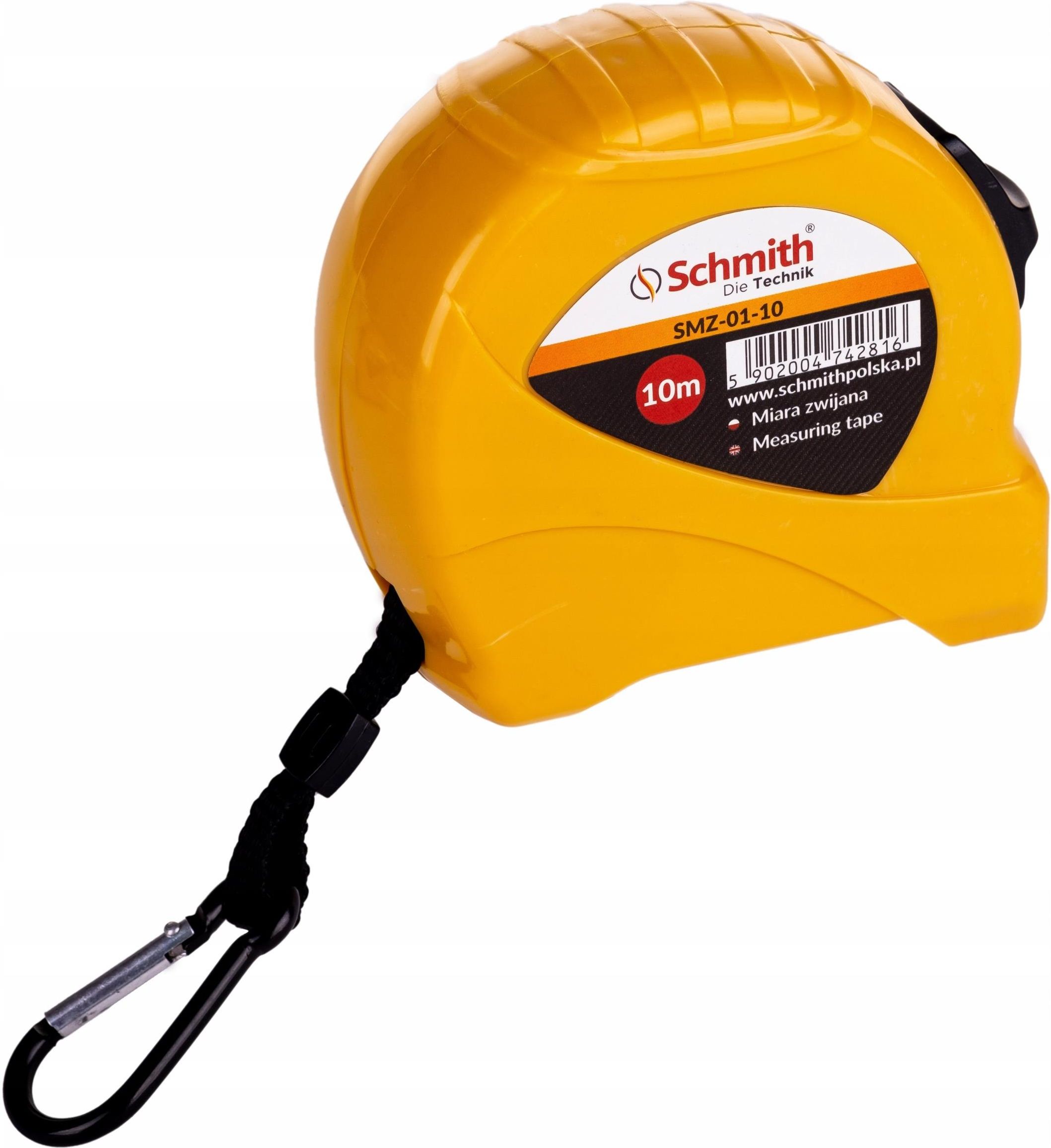 MIARA ZWIJANA 10 m Schmith SMZ-01-10 Uniwersalna, stalowa miara. Posiada praktyczny klips oraz karabińczyk umożliwiający zaczepienie miarki. duża, wyraźna podziałka – nadruk odporny na ścieranie mechanizm automatycznego zwijania taśmy blokada taśmy po naciśnięciu ułatwiająca dokonywanie pomiarów mocna sprężyna ergonomiczna i lekka klasa dokładności: II zastosowane 3 nity (zdecydowanie trwalsze rozwiązanie niż tradycyjne 2 nity)
