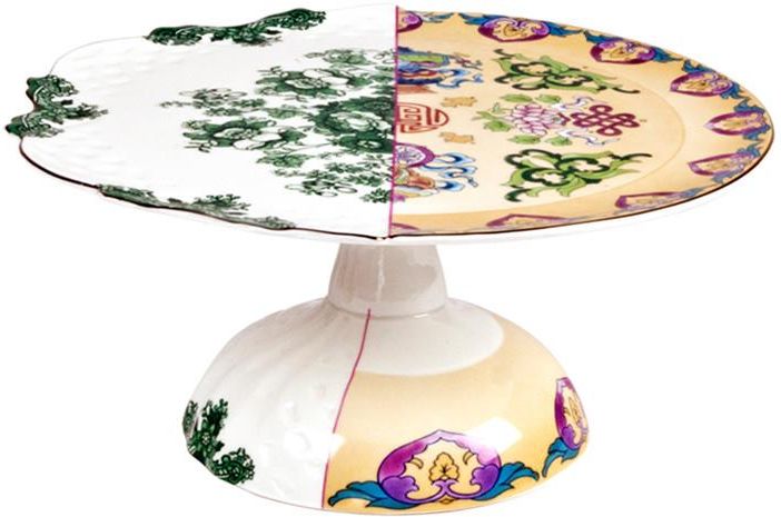 Wyjątkowy pomysł i doskonałe wykonanie! Ta patera na ciasta i owoce będzie znakomicie wyglądała na elegancko zastawionym stole. Z jednej strony gładkie brzegi i dekoracyjne motywy w żółtych, zielonych i niebieskich barwach, z drugiej brzegi lekko nieregularne, pofalowane i utrzymane w kolorystyce ciemnej zieleni. Warto zwrócić uwagę na nóżkę patery: ona również podzielona jest na 2 rodzaje wykończenia. Naczynia Seletti Hybrid to symboliczne połączenie estetyki wschodu i zachodu. Każde z naczyń składa się z 2 trwale połączonych ze sobą części prezentujących odmienną kulturę i typowe dla niej motywy artystyczne, kulturowe i historyczne. Całość powstała w Tangshan stolicy kostnej porcelany i została wytworzona ręcznie, z dbałością o najdrobniejsze szczegóły. Poziom bieli i przezroczystości zdecydowanie wyższy niż w klasycznej porcelanie oraz duża wytrzymałość mechaniczna to dodatkowe zalety, na które warto zwrócić uwagę. Patera została zapakowana w bezpieczne, ekologiczne opakowanie, które świetnie nadaje się na oryginalny prezent.
