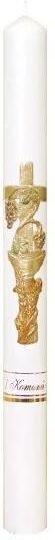 Świeca do Pierwszej Komunii Świętej dla dziewczynki i chłopca z aplikacją w kolorze złotym. Średnica: 35mm Wysokość: 40cm