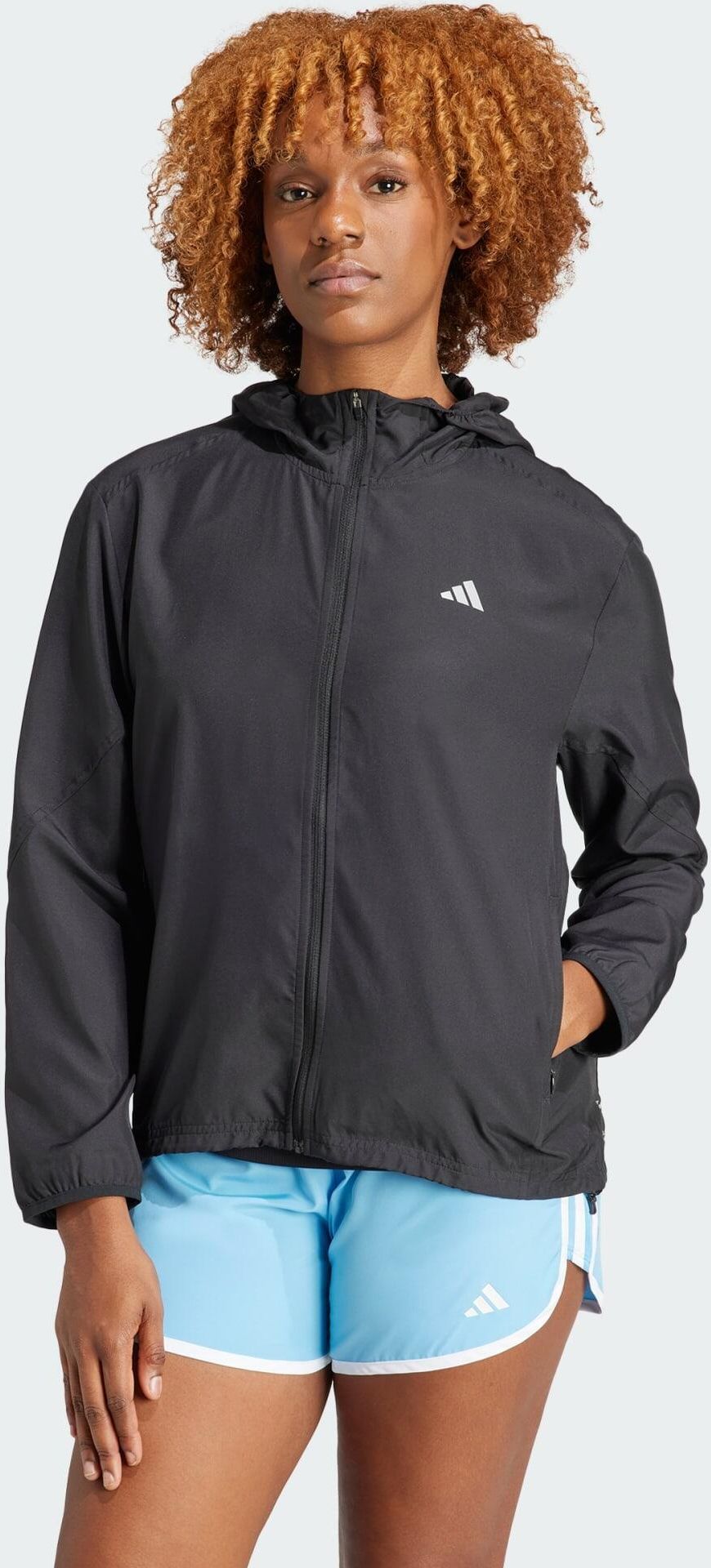 Kurtka do biegania z regulowanym kapturem wykonana częściowo z materiałów pochodzących z recyklingu.