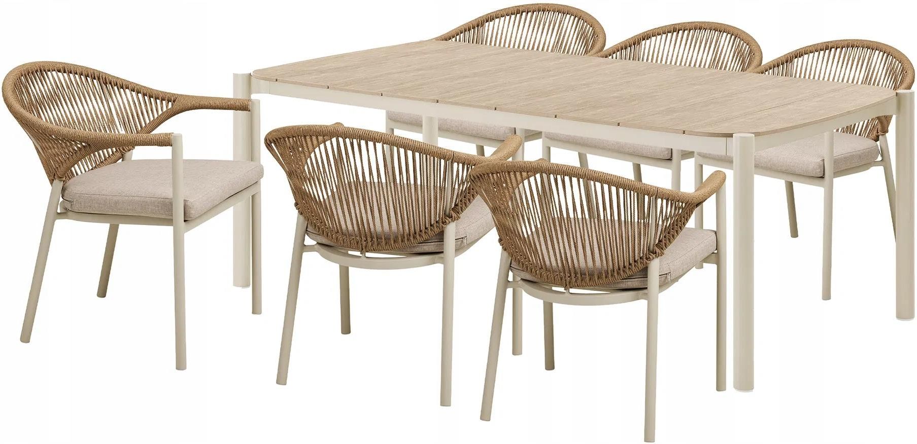 Zestaw ogrodowy jadalniany ABELA stół 100x200 cm + 6 krzeseł to idealne rozwiązanie dla każdego, kto pragnie stworzyć strefę relaksu na swoim tarasie lub w ogrodzie. Zestaw łączy nowoczesny design z funkcjonalnością, co sprawia, że stanie się doskonałym uzupełnieniem przestrzeni zewnętrznej. Wyróżnia się minimalistycznym, ale zarazem stylowym wyglądem. Wykonany z wysokiej jakości materiałów charakteryzuje się dużą trwałością oraz odpornością na niekorzystne warunki atmosferyczne. Dzięki swojej kolorystyce doskonale wpisuje się w różnorodne style aranżacyjne, od nowoczesnych po bardziej klasyczne. Zestaw ogrodowy ABELA stół + 6 krzeseł to doskonała propozycja dla osób poszukujących eleganckiego, funkcjonalnego i wygodnego wyposażenia do swojej przestrzeni zewnętrznej Niezależnie od pory roku, zestaw ten pozwoli cieszyć się chwilami spędzonymi na świeżym powietrzu w miłym i estetycznym otoczeniu. Wymiary stołu: 100x200x74 cm Wymiary krzesła Szerokość:60cm Głębokość:59,5cm Wysokość: 76cm Szerokość siedziska: 50cm Głębokość siedziska:46 cm Wysokość siedziska: 50cm