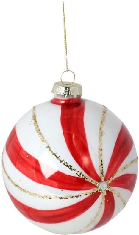 Komplet 12 bombek wykonanych z dmuchanego szkła. Utrzymane w kolorze czerwonym i białym. Ozdobione brokatem.