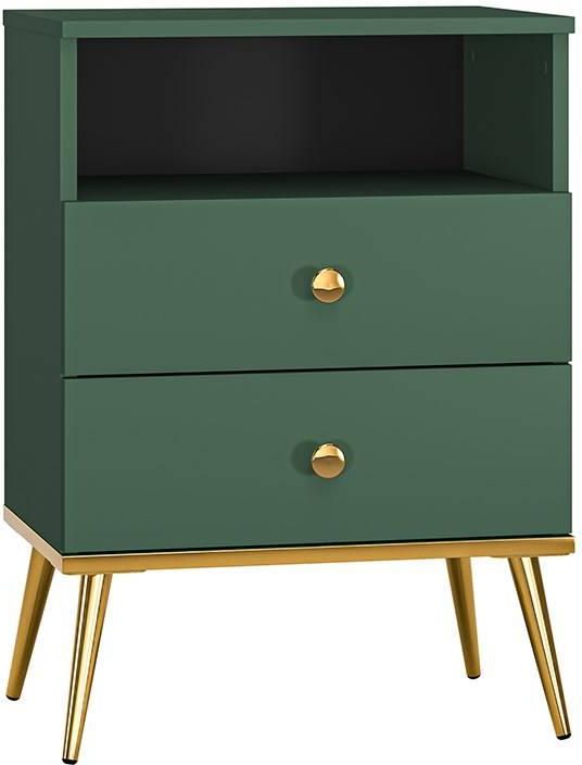 Szafka nocna FOREST 10 O kolekcji: Meble z kolekcji FORREST to idealny wybór dla każdego, kto ceni elegancję oraz niebanalny wygląd. Są nie tylko praktyczne, ale zawierają także doskonały element dekoracyjny w postaci złotych uchwytów. Cechą charakterystyczną kolekcji jest ich zielony kolor, który nadaje wnętrzu harmonię. Barwa ta doskonale nadaje się do innych odcieni, zarówno pastelowych, jak i neutralnych, co pozwala na połączenie różnych stylów. Złote uchwyty oraz nóżki dodają elegancji i luksusu. Meble te poza swoim estetycznym aspektem są również wyjątkowo funkcjonalne. Witryny, komody, czy stoliki pozwolą stworzyć praktyczną i komfortową przestrzeń. O meblu: Szafka nocna została wyposażona w dwie szuflady oraz otwartą wnękę. Wymiary: Szerokość: 50 cm Wysokość: 70 cm Głębokość: 34 cm Dostępny kolor: Zielony + Złoty