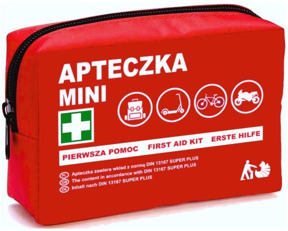 Apteczka MINI - DIN 13167 - PLUS Bardzo bogato wyposażona apteczka MINI, będąca najwyższym standardem wyposażenia na rynku wśród apteczek motocyklowych, turystycznych i osobistych. Zawiera kompletne wyposażenie opatrunkowe niezbędne do udzielenia pierwszej pomocy w terenie. Zawiera dużą ilość …