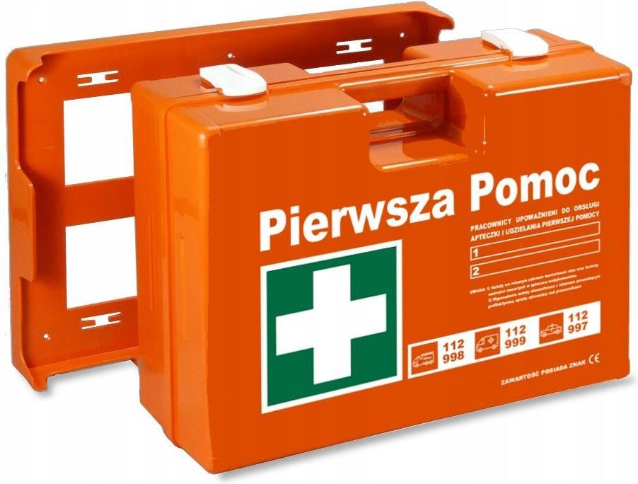 Apteczka pierwszej pomocy wykonana z wysokiej jakości tworzywa ABS. Pudełko posiada gumową uszczelkę, która zapobiega przedostawaniu się kurzu oraz wilgoci, uchwyt umożliwiający powieszenie na ścianę oraz wspornik umożliwiający otwarcie pudełka pod kątem 90 o. Kolor apteczki oraz napisy nanoszone są w formie sitodruku. Wnętrze apteczki podzielone jest płytkami umożliwiającymi regulację wielkości przegród. Apteczka dla dużych i średnich zakładów pracy w bardzo atrakcyjnym i trwałym opakowaniu. Posiada uszczelkę chroniącą przed kurzem i zalaniem oraz możliwość plombowania. Przeznaczona jest dla ochrony maksymalnie 50 osób, w zależności od specyfiki miejsca które podlega ochronie. Zawiera bogate wyposażenie opatrunkowe niezbędne do udzielenia pierwszej pomocy w dużych i średnich firmach, urzędach, placówkach oświatowych, hotelach lub ośrodkach wczasowych. Opakowanie apteczki wykonane jest z trwałego i odpornego na uderzenia tworzywa a wyposażenie wewnątrz umieszczone jest za przeźroczystą pleksi w czytelny sposób w plastikowych przegrodach. Wyposażona ponadto jest w wygodny uchwyt do przenoszenia i stelaż do mocowania na ścianie, dzięki temu jest mobilna i może służyć do udzielania pierwszej pomocy poza miejscem przechowywania. Zawiera bardzo dużą ilość opatrunków sterylnych, opasek elastycznych, plastrów, opatrunki siatkowe, opatrunki na oko oraz sterylne opatrunki indywidualne typu K ,M i G zawierające kompletny opatrunek wraz z kompresem, którym poszkodowana osoba bez trudu może opatrzyć się sama. Ponadto zawiera takie elementy jak koce ratunkowe (folia życia), 2 pary bezpiecznych nożyczek ratunkowych czy w końcu bardzo czytelną, ilustrowaną instrukcję udzielania pierwszej pomocy w postaci małej broszury. Skład apteczki 2x DIN 13157 PLUS: Opatrunek indywidualny G DIN 13151, 10cm x 12 cm (wyrób sterylny): 2 szt. Opatrunek indywidulany K DIN 13151, 6cm x 8cm (wyrób sterylny): 2 szt. Opatrunek indywidualny M DIN 13151, 8cm x 10cm (wyrób sterylny): 6 szt. Opaska podtrzymująca elastyczna 6cm: 4 szt. Opaska podtrzymująca elastyczna 8cm: 4 szt. Chusta opatrunkowa 60cm x 80cm, DIN 13152-A (wyrób sterylny): 2 szt. Chusta trójkątna z fizeliny biała 96cm x 96cm x 136cm, DIN 13168-D: 4 szt. Chusta z flizeliny na twarz 20cm x 30cm (wyrób sterylny): 10 szt. Kompres 10cm x 10cm (2szt) (wyrób sterylny): 6 op. Kompres na oko 5,6cm x 7,2cm (wyrób sterylny): 4 szt. Koc ratunkowy 160cm x 210cm srebrno/złoty: 2 szt. Przylepiec 5m x 2,5cm, DIN 13019-A: 2 szt. Zestaw plastrów do składu DIN 13157 i DIN 13169: 2 op. Zimny kompres (suchy lód) 15cm x 17cm: 2 szt. Plaster z opatrunkiem elastyczny, 10cm x 6cm - 12szt: 2 op. Jednorazowa maska medyczna EN 14683:2019 TYP 1: 4 szt. Rękawice winylowe: 8 szt Nożyczki ratownicze 19cm: 1 szt. Chusteczki nasączone do dezynfekcji: 8 szt. Instrukcja udzielania pierwszej pomocy: 1 szt. DODATKOWO: Ustnik do sztucznego oddychania - 1 szt. Dzięki przeźroczystej pleksi widać, gdzie znajduje się pożądany opatrunek UWAGA! Dodatkowo do każdej naszej apteczki dokładany jest zestaw montażowy. Dzięki temu zawieszenie naszej apteczki na ścianie przebiegnie szybko i bezproblemowo! Produkt wysokiej jakości bezpośrednio od importera. Apteczka przed wysyłką jest solidnie zabezpieczona w folie bąbelkową oraz gruby karton. Zastosowanie: Średnie i duże firmy, oddziały i hale produkcyjne, duże biura, urzędy, placówki oświatowe, hotele, ośrodki wczasowe i konferencyjne, dla zabezpieczenia imprez masowych itp. Wymiary: 450 x 335 x 165 mm Wyrób spełnia wymagania norm Unii Europejskiej Apteczka zawiera: stelaż mocujący do ściany Na innej naszej aukcji można nabyć do apteczki instrukcję udzielania pierwszej pomocy oraz instrukcje p.poż
