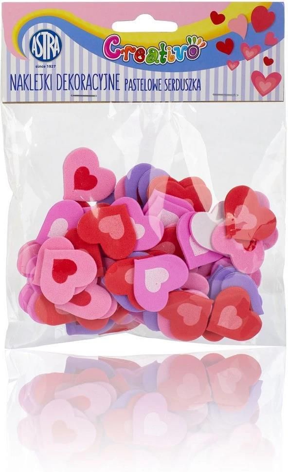 Naklejki samoprzylepne na piance Astra Creativo - Pastelowe serduszka. Idealne do prac plastycznych, scrapbookigu, ozdabiania bombek i jajek styropianowych, kartek okolicznościowych, zaproszeń i zakładek do książek oraz do tworzenia dekoracji świątecznych.