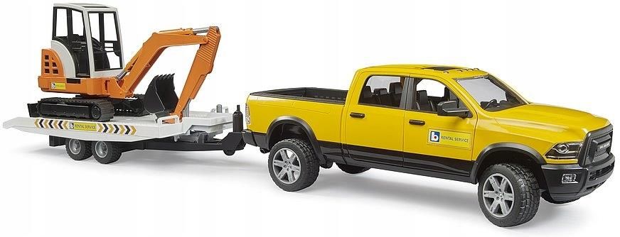 Auto Dodge RAM 2500 Service z przyczepką i mini koparką Bruder 02546 Wypożyczalnie maszyn budowlanych stanowią ogromne wsparcie zarówno dla firm, jak i osób prywatnych, gdy na placu budowy nagle potrzeba dodatkowej maszyny. Mimo szerokiej gamy produktów BRUDER może się zdarzyć, że w piaskownicowej „strefie budowy” wciąż brakuje małej koparki. Właśnie dlatego powstał najnowszy zestaw złożony z RAM Powerwagon z przyczepą oraz minikoparką BRUDER. Wytrzymałość i siła uciągu RAM-a są niezwykłe. Zabawka, podobnie jak jej pełnowymiarowy pierwowzór, została wyposażona w czterodrzwiową kabinę typu CREW Cab. Wszystkie drzwi można otworzyć, zapewniając miejsce dla 4 figurek bworld. Model w skali 1:16 posiada amortyzowane osie dla lepszej przyczepności w terenie, a przednią osią można sterować za pomocą dołączonego przedłużenia kierownicy. Do transportu ładunku w trakcie zabawy służy otwierana tylna klapa, a przestrzeń ładunkowa pomieści palety Bruder, skrzynie siatkowe czy bele słomy. Do zestawu dołączono przyczepę z podpórką dyszla; jej platformę można podnosić za pomocą dźwigni, ułatwiając załadunek. Minikoparka BRUDER, również w zestawie, jest w pełni funkcjonalna: posiada zdejmowaną łyżkę, regulowany lemiesz oraz odchylany na boki wysięgnik. Kabina koparki obraca się o 360°, a pojazd porusza się na nowoczesnych gumowych gąsienicach. Zestaw ten można dodatkowo wzbogacić o AUSA Minidumper (nr art. 02449), Cat® kompaktową ładowarkę przegubową (nr art. 02485) oraz wiele innych pojazdów budowlanych BRUDER. Najważniejsze cechy Kabina • Szyby kabiny wykonane z przezroczystego, odpornego na stłuczenia tworzywa sztucznego Konstrukcja pojazd • Możliwość sterowania za pomocą dodatkowej kierownicy przez dach • Kippowana przyczepa Podwozie • Gumowe gąsienice Ruch / Funkcje • W pełni funkcjonalny ramię koparki Ogólne informacje • Uwaga! Nieodpowiednie dla dzieci poniżej 36 miesięcy – zagrożenie zadławieniem drobnymi elementami. • Zalecany wiek: od 4 lat, do zabawy w domu i na zewnątrz • Zabawka wykonana z wysokiej jakości tworzyw sztucznych (np. ABS) • Skala 1:16