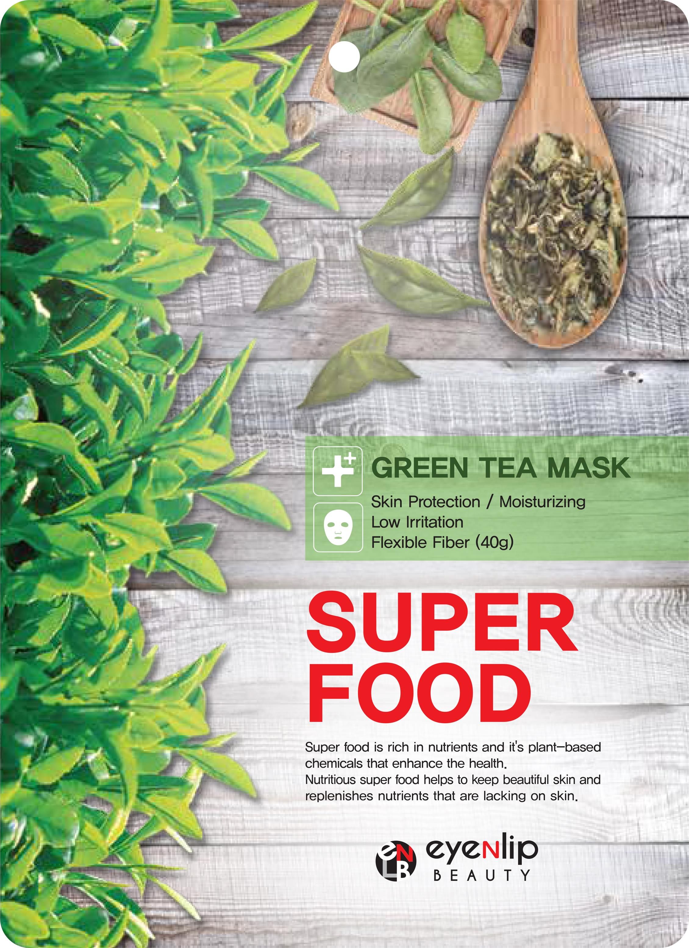 Eyenlip Beauty SuperFood Green Tea nawilżająco-łagodząca maska w płachcie. Skład: INCI: Water, Glycerin, Dipropylene Glycol, Polyglyceryl-10 Laurate, Diethylhexyl sodium Sulfosuccinate, Xanthan Gum, Sodium Hyaluronate, Chlorphenesin, Hydroxyethylcellulose, Butylene Glycol, Camellia Synensis Leaf …