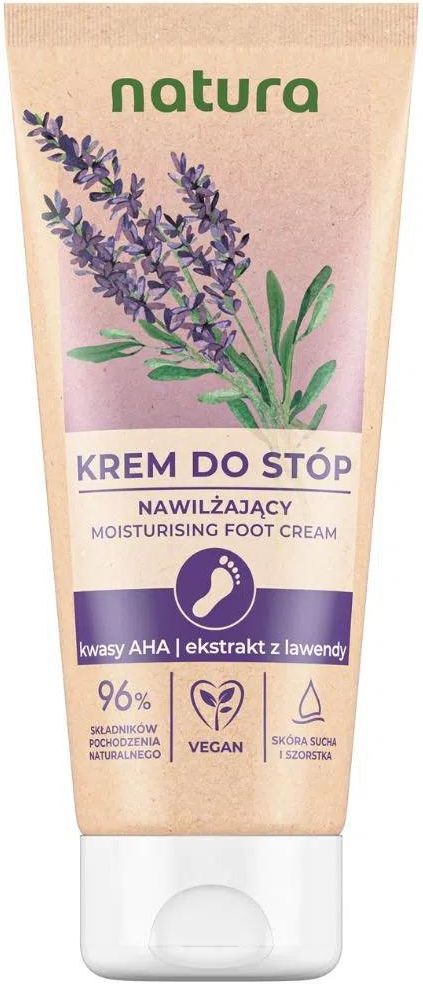 Natura nawilżający krem do stóp – kwasy AHA, ekstrakt z lawendyKrem do stóp błyskawicznie nawilża, wygładza suchą i zrogowaciała skórę stóp. Naturalne kwasy owocowe - alfahydroksykwasy delikatnie złuszczają pobudzając proces odnowy komórek naskórka. Ekstrakt z kwiatów lawendy i alantoina działają odświeżająco i łagodząco, a dodatek witaminy E wykazuje działanie regenerujące. Naturalne emolienty w postaci : oleju avocado, oleju kokosowy i masła shea wspomaga odbudowę warstwy lipidowej naskórka. Już po pierwszym użyciu stopy staną się miękkie i gładkie.Sposób użyciaWarstwę kremu nanieść na umytą skórę stóp. Wmasować do całkowitego wchłonięcia. Dla uzyskania najlepszego efektu należy stosować codziennie.
