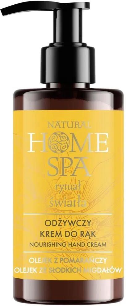 Natural Home SPA odżywczy krem do rąk – olejek z pomarańczy oraz olejek ze słodkich migdałówOdżywczy krem do rąk NATURAL HOME SPA to aż 98% składników pochodzenia naturalnego, nawiązujących do rytuału Światła, zapewniającego energię i witalność dla ciała i zmysłów.Krem przynosi ulgę suchym dłoniom, które wymagają intensywnej odbudowy naskórka. Naturalne, drogocenne składniki roślinne takie jak olejek z włoskich pomarańczy, olej ze słodkich migdałów, masło shea oraz witamina E wspomagają regenerację i nawilżenie skóry rąk.Bogaty, odświeżający, cytrusowy zapach z ciepłą nutą cynamonu, goździków i imbiru zamykają aromaty bursztynu i piżma. Produkt przebadany dermatologicznie.Jak używaćOdpowiednią ilość kremu nanieś na skórę dłoni i wmasuj.O marce Natural Home SPANatural Home SPA to marka naturalnych kosmetyków stworzona z myślą o celebrowaniu momentów i drobnych przyjemności, dzięki kojącej sile rytuałów.Zaawansowane i starannie opracowane formuły Natural Home SPA czerpią z wiedzy, mądrości i doświadczenia naszych przodków, dlatego odwołują się do tradycyjnych zabiegów, składników i rytuałów pielęgnacyjnych znanych od pokoleń.Intensywne i orientalne zapachy silnie oddziałują na zmysły, będąc swoistą aromaterapią, a wysoka zawartość składników pochodzenia naturalnego doskonale odżywia i pielęgnuje skórę.Natural Home SPA czerpie z uzdrawiającej mocy natury i chce się jej odwdzięczyć, dlatego też wszystkie opakowania marki oraz receptury zostały dobrane tak, aby ograniczyć wpływ produktu na środowisko naturalne.