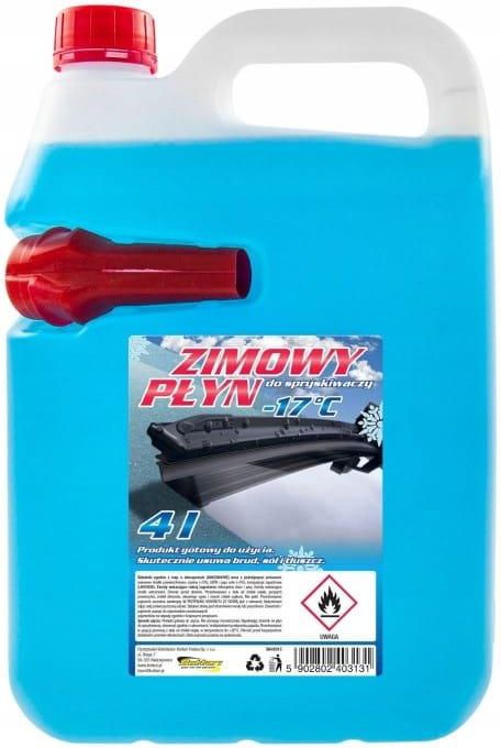Zimowy płyn do spryskiwaczy -17°C 4L – skuteczne czyszczenie szyb Zimowy płyn do spryskiwaczy to niezawodny preparat, który zapewnia idealnie czyste szyby samochodowe nawet w trudnych warunkach zimowych. Skutecznie usuwa tłuszcz, sól i brud drogowy, pozostawiając szyby błyszczące i wolne od smug. Dzięki odporności na temperatury do -17°C gwarantuje bezpieczną i komfortową jazdę w mroźne dni. Butelka o pojemności 4 litrów została wyposażona w praktyczny lej dozujący, który ułatwia napełnianie zbiornika bez ryzyka rozlewania. Produkt jest gotowy do użycia i posiada przyjemny zapach, co dodatkowo podnosi komfort jego stosowania. Cechy produktu: pojemność: 4 litry, skuteczne czyszczenie szyb do temperatury -17°C, usuwa tłuszcz, sól i brud drogowy, nie pozostawia smug, gotowy do użycia, wyposażony w praktyczny lej dozujący, przyjemny zapach. Najważniejsze zalety: gwarantuje czyste i przejrzyste szyby w zimowych warunkach, chroni przed smugami i osadami, odporny na mróz do -17°C, łatwe i wygodne stosowanie dzięki wbudowanemu lejkowi, duża pojemność 4L – wydajny i ekonomiczny. Zimowy płyn do spryskiwaczy -17°C 4L to praktyczny wybór dla każdego kierowcy, który ceni skuteczność, bezpieczeństwo i wygodę w okresie zimowym.