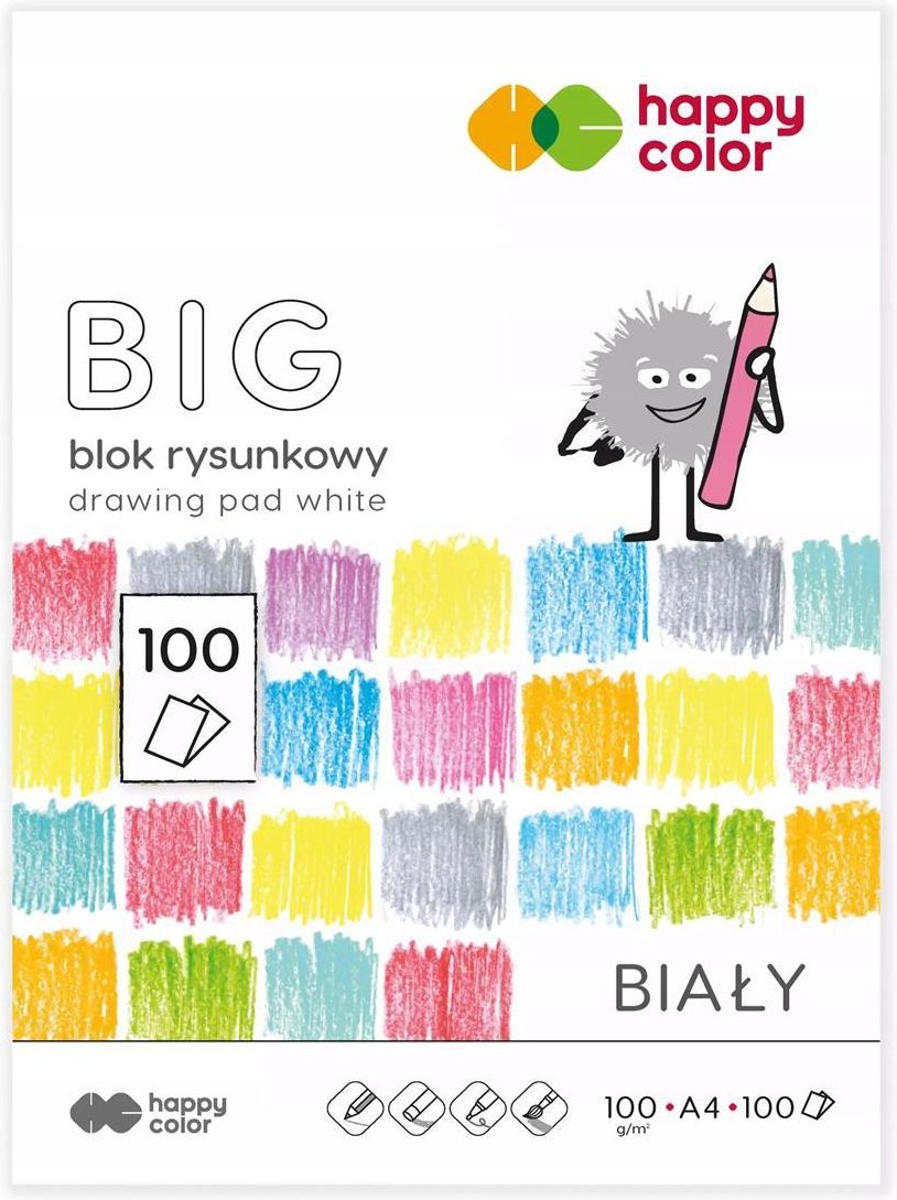 Blok rysunkowy biały A4/100K BIG HAPPY COLOR Blok rysunkowy biały A4/100K BIG HAPPY COLOR Śnieżnobiały papier o lekko ziarnistej powierzchni idealny do rysowania kredkami. Najwyższa gramatura wśród bloków rysunkowych dla dzieci. Odporny na wielokrotne wymazywanie (nie mechaci się). Zawiera 100 …