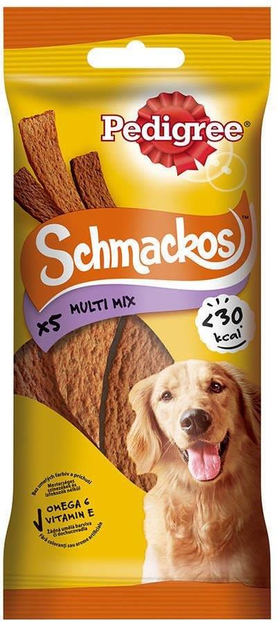 PEDIGREE® Schmackos to pyszna przekąska w postaci pasków z wołowiną, idealna do przegryzania dla dorosłego psa. Zawiera witaminy, minerały oraz kwasy tłuszczowe Omega-3. Bez sztucznych barwników i aromatów. Z PEDIGREE® Schmackos skutecznie troszczysz się o zdrowie i witalność swojego pupila. Przekąska ta została opracowana przez specjalistów ds. żywienia i lekarzy weterynarii w Centrum Żywienia Zwierząt WALTHAM™. Korzyści z podawania psu przysmaków PEDIGREE W dobrej kondycji - Z kwasami Omega-3 utrzymasz psa w dobrej formie przez całe życie. Zęby i kości - Przekąska zawiera wapń, który jest niezbędny dla zachowania zdrowych zębów i mocnych kości. Naturalna odporność - Witaminy i minerały pomagają utrzymać i wzmocnić naturalną odporność psa. Skład: mięso i produkty pochodzenia zwierzęcego (łącznie 42%, w tym 27% wołowiny), produkty pochodzenia roślinnego, substancje mineralne, zboża, cukry, oleje i tłuszcze. Kaloryczność: 313 kcal/100 g Dodatki / 1 kg: Przeciwutleniacze / Dodatki dietetyczne: Witamina A: 2546 IU, Witamina E: 25,5 IU, Siarczan żelaza jednowodny: 46,4 mg. Składniki analityczne (%): białko: 27; zawartość tłuszczu: 11; materia nieorganiczna: 9; włókno surowe: 3; wilgotność: 19; wapń: 1,1; kwasy tłuszczowe Omega-3: 1866 mg/kg. Sposób karmienia Małe psy np. jamnik: nie więcej niż 1 sztuka dziennie. Średnie psy np. cocker spaniel: do 1,5 sztuki dziennie. Duże psy np. labrador: do 3 sztuk dziennie. Należy odpowiednio zmniejszyć dawkę głównego posiłku. Po otwarciu opakowania zużyć w ciągu 14 dni. Przechowywać w suchym i chłodnym miejscu. Zapewnij psu świeżą wodę do picia.