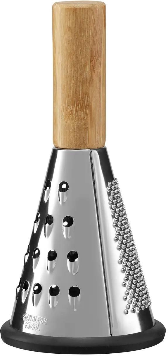 Tarka kuchenna z wygodnym bambusowym uchwytem. Posiada 3 rodzaje oczek, oraz gumową podstawę antypoślizgową. Doskonała do ucierania sera, czekolady, przypraw itp.. Długość 9 cm Szerokość 9 cm Wysokość 15 cm