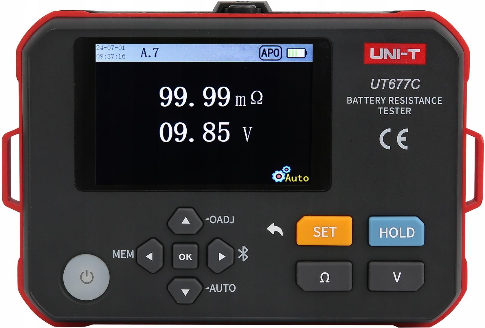 Miernik Uni-T UT677C UNI-T UNI‑T UT677C – profesjonalny tester rezystancji akumulatorów Zaawansowany miernik z serii UT677, przeznaczony do diagnostyki akumulatorów ołowiowych i litowych, kondensatorów – niezwykle przydatny w serwisie UPS, stacjach PV, przemyśle i warsztatach. Metoda pomiaru 4‑przewodowa redukuje wpływ przewodów, co zapewnia bardzo rzetelne wyniki Najważniejsze cechy Pomiar wewnętrznej rezystancji (ESR): 0,000 mΩ–3 Ω, cztery zakresy, rozdzielczość od 1 µΩ do 100 mΩ, dokładność ±0,5 % fs + 15 cyfr, lub ±1 % fs + 20 cyfr na najniższym zakresie — profesjonalna precyzja Zakres napięcia: rozszerzony do 0–120 V DC, w trzech podzakresach: 0‑7 V, 7‑100 V, 100‑120 V, dokładność ±0,2 % fs + 10 cyfr . Test prądem: 2–200 mA, technologia 4-terminal AC 1 kHz — minimalizacja zakłóceń Wyświetlacz: kolorowy ekran 3,5″ (480×320 px) – wyraźny, intuicyjny i przejrzysty Rejestracja danych: zapamiętanie 500 wyników; funkcje PASS/WARN/FAIL z alarmami progowymi; tryb Auto/Manual HOLD Interfejsy: USB‑C i Bluetooth – przesył danych do PC oraz obsługa przez aplikację mobilną . Zasilanie: wbudowany akumulator 11,1 V/2600 mAh; wyłącznik automatyczny po 15 min; wskaźnik poziomu – 5-stopniowy Bezpieczeństwo: izolacja i test przebicia 3700 V RMS; zgodność z IEC 61010; ochrona przed zakłóceniami magnetycznymi <40 A/m Specyfikacja techniczna Parametr: Zakres/Specyfikacja Rezystancja wewn.: 0–3 mΩ, 3–30 mΩ, 30–300 mΩ, 0.3–3 Ω; dokładność ±0,5 % fs + 15 cyfr; 1 µΩ/10 µΩ/100 µΩ/100 mΩ cztery zakresy Napięcie: 0–7 V / 7–100 V / 100–120 V; rozdzielczość 1 mV, 10 mV; dokładność ±0,2 % fs +10 cyfr . Prąd testu: 2–200 mA, AC 1 kHz, 4‑przewodowy pomiar . Czas reakcji: ~200 ms; pełny odczyt ~2 s . Ekran: Kolorowy LCD 3,5″, 480×320 px . Rejestrowanie danych: 500 zapisów, alarmy progowe, tryby HOLD . Interfejsy: USB‑C, Bluetooth (app + PC software) . Zasilanie: 11,1 V / 2600 mAh Li-ion; auto-off, 5-stopniowy wskaźnik . Bezpieczeństwo: 3700 V RMS przebicie, IEC 61010, odporność EMC . Wymiary / Waga: 170 × 115 × 65 mm, ~674 g . Zakres temp. pracy: –10…40 °C; przechowywania –20…60 °C . Zastosowania i zalety Kompleksowa diagnostyka akumulatorów stacjonarnych, motoryzacyjnych, w stacjach UPS/PV, magazynach energii – do 120 V. Automatyczne raporty PASS/WARN/FAIL i przechowywanie danych to duży atut w zakładach produkcyjnych, serwisach i nadzorze instalacji. Wysoki próg bezpieczeństwa i izolacja umożliwiają prace w trudnych środowiskach i przy wyższych napięciach. Bluetooth/USB ułatwiają integrację z systemami analizy danych i zdalne monitorowanie. Zawartość zestawu Zestaw standardowy powinien zawierać: Miernik UT677C, Przewody pomiarowe z końcówkami (krokodyle/probki), Kabel USB‑C, zasilacz Instrukcja obsługi EN, Etui + kartonowe opakowanie. Porównanie mierników: UNI-T UT677C vs. UT677A+ Co oznaczają te różnice? UT677C ma większy zakres napięcia – do 120 V, co czyni go bardziej uniwersalnym narzędziem dla: akumulatorów stacjonarnych HV (w magazynach energii), systemów UPS z większym napięciem wyjściowym, dużych instalacji PV, gdzie napięcia przekraczają 100 V. UT677A+ będzie wystarczający do większości zastosowań, np. testowania standardowych akumulatorów 12 V, 24 V, 48 V, czy 96 V w sprzęcie przemysłowym, magazynach, motoryzacji. Podsumowanie – który model wybrać? Potrzeba użytkownika: Rekomendowany model Diagnostyka UPS, motoryzacja, akumulatory ≤ 100 V: UT677A+ Magazyny energii, fotowoltaika, akumulatory > 100 V: UT677C Pełna elastyczność pomiarowa: UT677C Tylko standardowe zastosowania (≤ 100 V): UT677A+ ----------- ZAKRESY POMIAROWE ---------- Zakres wewnętrznej rezystancji akumulatora: 0 mOhm ~ 3 mOhm: ±1% ±20 (Rozdzielczość 1 uOhm) 3 mOhm ~ 30 mOhm: ±0,5% ±15 (Rozdzielczość 10 uOhm) 3 mOhm ~ 300 mOhm: ±1% ±15 (Rozdzielczość 100 uOhm) 300 mOhm ~ 3 Ohm: ±0,5% ±15 (Rozdzielczość 100 uOhm) Zakres napięcia akumulatora: 0 V ~ ±7 V: ±0,2%±10 (Rozdzielczość 1 mV) 7 V ~ 100 V: ±0,2%+10 (Rozdzielczość 10 mV) 100 V ~ 120 V: ±0,2%+10 (Rozdzielczość 100 mV) ----------- FUNKCJE DODATKOWE ----------- Wyświetlacz: 3,5’’ Rozdzielczość wyświetlacza: 480 x 320 px Czas pomiaru: ok. 2 sek. Interfejs USB Aplikacja Bluetooth Zapis danych: do 5000 wpisów Trzy progi alarmów ----------- CECHY OGÓLNE ----------- Wymiary produktu: 190 x 121 x 51 mm Waga produktu: 674 g