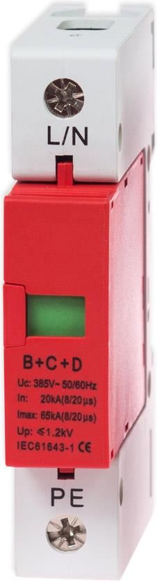 OGRANICZNIK PRZEPIĘĆ DO FOTOWOLTAIKI 1-POLOWY KLASY B+C+D klasa ochrony: B+C+D spełnianie wymogów klasy: I+II+III maks. napięcie pracy Uc: 385 V AC prąd próbny (8/20) In: 20 kA prąd maks. (8/20) Imax: 65 kA napięciowy poziom ochrony: temperatura składowania: -30/+70°C temperatura otoczenia pracy: …