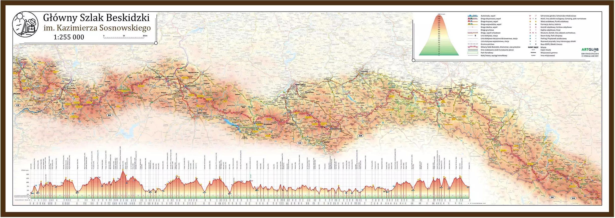 Wyrusz na wyjątkową przygodę w Beskidach!Wybierz się na wyprawę jednym z najdłuższych i najpiękniejszych szlaków turystycznych w Polsce - Głównym Szlakiem Beskidzkim. Podziwiaj wyjątkowe krajobrazy i zdobądź szczyty, z których rozpościera się panorama gór i dolin. Odpocznij w przytulnym schronisku i zasmakuj tradycji regionu, przechodząc przez urokliwe górskie miejscowości. Planowanie ułatwi ścienna mapa turystyczna Głównego Szlaku Beskidzkiego w skali 1:255 000. Mapa jest dodatkowo cieniowana, a szczegółowe odwzorowanie terenu korzystnie wpływa na jej czytelność. Oprawiona w elegancką aluminiową ramę, na magnetycznym podkładzie pozwala oznaczać odwiedzone miejsca nie uszkadzając jej. Ten rodzaj oprawy nadaje wnętrzu oryginalny charakter i pozwala zachować wspomnienia z podróży na co dzień.Twoja podróż przez malownicze BeskidyMapa ta przedstawia jeden z najdłuższych i najpiękniejszych szlaków turystycznych w Polsce – Główny Szlak Beskidzki. Rozciąga się on na ponad 500 km, prowadząc przez niezwykle zróżnicowane tereny Beskidów, od Ustronia w Beskidzie Śląskim aż po Wołosate w Bieszczadach. To idealna trasa zarówno dla miłośników pieszych wędrówek, jak i dla osób pragnących odkryć najpiękniejsze zakątki polskich gór. Atrakcje turystyczne na trasie Głównego Szlaku Beskidzkiego Przepiękne krajobrazy: Trasa szlaku przebiega przez różnorodne regiony, takie jak Beskid Śląski, Żywiecki, Sądecki, Gorce oraz Bieszczady, oferując turystom zapierające dech w piersiach widoki na doliny, lasy i grzbiety górskie. Zabytki i miejsca kultury: Na trasie znajdziesz wiele historycznych miejsc, takich jak cerkwie i zabytkowe kościoły, które dodają wędrówce unikalnego charakteru. Przechodząc przez urokliwe górskie miejscowości, możesz poznać lokalną kulturę i tradycje regionu. Schroniska górskie: Mapa zaznacza liczne schroniska, gdzie turyści mogą odpocząć, zjeść ciepły posiłek i przenocować. To idealne miejsca, by zregenerować siły na kolejne etapy wędrówki. Punkty widokowe: Na mapie wyróżnione są najpiękniejsze punkty widokowe, z których rozpościera się panorama gór i dolin. To doskonałe miejsca na przerwy i robienie pamiątkowych zdjęć. Funkcjonalność mapy Profil wysokościowy trasy: Dzięki profilowi wysokościowemu umieszczonemu poniżej mapy, możesz z łatwością zaplanować swoją wędrówkę, wiedząc, kiedy spodziewać się większych podejść lub zejść. To idealne narzędzie dla turystów szukających informacji o stopniu trudności poszczególnych odcinków. Oznaczenia szlaków: Oprócz Głównego Szlaku Beskidzkiego, mapa zawiera również inne ważne trasy turystyczne, które umożliwiają rozszerzenie wędrówki o dodatkowe atrakcje w regionie. Praktyczna dekoracja: Wysoka jakość druku i estetyczne wykonanie sprawiają, że mapa ta będzie piękną ozdobą każdego wnętrza, szczególnie dla miłośników górskich wędrówek i polskich krajobrazów. Mapa Głównego Szlaku Beskidzkiego to niezastąpiony towarzysz każdego turysty, który pragnie odkrywać uroki polskich Beskidów, cieszyć się pięknem natury i zdobywać nowe szczyty. Parametry techniczneMapa oprawiona jest w elegancką aluminiową ramę i naniesiona na podkład magnetyczny. Ten rodzaj podłoża sprawdzi się idealnie do oznaczania interesujących okolic lub miejsc, które zostały już odwiedzone przy użyciu magnesów. Podkład pozwala na zachowanie trwałości mapy, jednocześnie nie rezygnując z używania znaczników. W ten sposób nadasz swojemu wnętrzu oryginalny charakter, a wspomnienia z Twoich podróży będą Ci towarzyszyć na co dzień.W naszym sklepie dostępne są jeszcze inne wersje wykończenia mapy, takie jak: rama drewniana, podkład do wpinania #8220;pinboard#8221; i rurki PCV. Jeżeli jesteś zainteresowany jeszcze innym rodzajem oprawy mapy lub jej personalizacją, napisz do nas, a my chętnie zrealizujemy dla Ciebie zamówienie indywidualne!