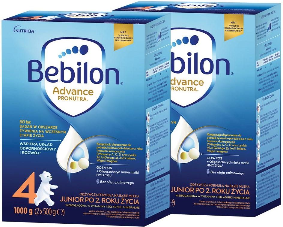 Bebilon 4 z Pronutra Advance - odżywcza formuła na bazie mleka, Junior po 2. roku życia, 1000 g Bebilon 4 Advance Pronutra to wysokiej jakości formuła mleka dla dzieci powyżej 2. roku życia, dostarczająca im ważnych składników odżywczych i wsparcia w ich zdrowym rozwoju. Specjalnie opracowana formuła Pronutra zawiera niezbędne witaminy, minerały i składniki odżywcze, które są istotne dla prawidłowego wzrostu i funkcjonowania dziecka. Składniki: Laktoza z mleka, odtłuszczone mleko w proszku, oleje roślinne (słonecznikowy, sojowy, kokosowy, rzepakowy) w zmiennych proporcjach, maltodekstryna, galaktooligosacharydy GOS z mleka (8,6%), produkt serwatkowy (odmineralizowana serwatka, koncentrat z serwatki) w proszku z mleka, wapń, fruktooligosacharydy FOS (0,6%), olej rybi, potas, magnez, sód, witamina C, emulgator (lecytyny z soi), żelazo, inozytol, cynk, przeciwutleniacz (palmitynian askorbylu), kwas pantotenowy, witamina E, aromat mleczny, niacyna, ryboflawina, witamina A, witamina B6, tiamina, jod, kwas foliowy, witamina K, witamina D, biotyna, witamina B12. Wartość odżywcza w 100 ml spożywanego płynu: Wartość energetyczna 273 kJ / 65 kcal, Tłuszcz 2,7 g, nasycone kwasy tłuszczowe 0,71 g, jednonienasycone kwasy tłuszczowe 1,2 g, wielonienasycone kwasy tłuszczowe 0,7 g, Węglowodany 8,6 g, cukry 6,4 g, Błonnik 0,6 g, Białko 1,3 g, Sól 0,06 g, Witamina A 74 µg 19%, Witamina D 3,25 µg 46% Witamina E 1,5 mg 30% Witamina K 6,6 µg 55% Witamina C 14 mg 31% Tiamina (witamina B1) 0,04 mg 8% Ryboflawina (witamina B2) 0,23 mg 33% Niacyna (witamina B3) 0,24 mg Witamina B6 0,065 mg 9% Kwas foliowy 7,7 µg Witamina B12 0,32 µg 40% Biotyna1,6 µg 16% Kwas pantotenowy 0,61 mg 20% Potas 100 mg 10% Chlorek 51 mg 10% Wapń 120 mg 22% Fosfor 66 mg 12% Magnez 9,7 mg 12% Żelazo 1,3 mg 16% Cynk 0,39 mg 8% Jod 16 µg 20% Kwas alfa-linolenowy (ALA) 66,7 mg GOS/FOS (9:1) 0,76 g 3’GL (3′-galaktozylolaktoza) 0,010 g. Masa netto: 1000 g Właściwości i przeznaczenie: Okres po 2. roku życia to wyjątkowy czas dla Twojego dziecka. To kolejny, ważny etap w jego rozwoju i czas nabywania wielu nowych umiejętności. Kompozycja dopasowana do potrzeb żywieniowych dzieci po 2. roku. Witaminy A, C, D oraz cynk dla prawidłowego funkcjonowania układu odpornościowego. Jod i żelazo dla prawidłowego rozwoju poznawczego. Wapń i magnez dla mocnych kości. ALA (Omega 3) dla rozwoju mózgu i tkanek nerwowych (w porcji 200 ml). HMO 3’GL: Oligosacharyd mleka kobiecego. 3’GL pochodzi z naszego unikalnego procesu. Unikalna kompozycja oligosacharydów GOS/FOS odwzorowuje kompozycję oligosacharydów mleka matki. Zalecane dzienne spożycie: Powyżej 2 roku życia: 180 ml wody z 6 płaskimi miarkami proszku, 2 razy na dobę. 1. Umyj ręce i wyparz naczynia potrzebne do przygotowania produktu. 2. Świeżą wodę pitną gotuj przez 5 min, po czym pozostaw do schłodzenia (do ok. 40 °C). Do wyparzonego kubka wlej odpowiednią ilość wody (wg tabeli żywienia). 3. Otwierając produkt, ostrożnie oderwij folię zabezpieczającą, aby uniknąć ewentualnego skaleczenia. Używając wyłącznie załączonej, umytej i wysuszonej miarki, odmierz dokładną liczbę płaskich, nieubitych porcji proszku i dodaj je do przygotowanego kubka. Przestrzegaj wartości podanych w tabeli żywienia. 4. Zamknij kubek i energicznie potrząsaj pionowo do całkowitego rozpuszczenia proszku. 5. Sprawdź temperaturę produktu wewnętrzną stroną przegubu dłoni. Kubek umyj od razu po użyciu. Przeciwwskazania: Nieprzegotowana woda, niewygotowane butelki lub nieprawidłowe przygotowanie mleka może zaszkodzić Twojemu dziecku. Zawsze przed przygotowaniem porcji mleka przegotuj wodę i wyparz butelkę. Pamiętaj, aby przygotować mleko zgodnie z instrukcją na opakowaniu i każdorazowo przygotuj tylko jedną porcję mleka, którą od razu podasz dziecku. Niewłaściwe przygotowanie, przechowywanie może stanowić zagrożenie dla zdrowia dziecka. Nie przechowuj resztek mleka – niezjedzoną porcję mleka należy od razu wyrzucić. Zawsze przytrzymuj dziecko podczas karmienia. Przechowywanie: Dla zachowania najwyższej jakości i właściwości produktu przed użyciem i po otwarciu przechowuj produkt w szczelnie zamkniętym, oryginalnym opakowaniu, w suchym miejscu, w temp. poniżej 25 °C. Nie przechowuj produktu w lodówce. Zawartość opakowania należy zużyć do 4 tygodni po pierwszym otwarciu. Nie zaleca się przesypywania produktu do innych pojemników. Oryginalne opakowanie powinno być wyrzucone dopiero po wykorzystaniu zawartości ze względu na umieszczone na nim ważne informacje. Producent: Nutricia Polska Sp. z o.o. ul. Bobrowiecka 8, 00-728 Warszawa