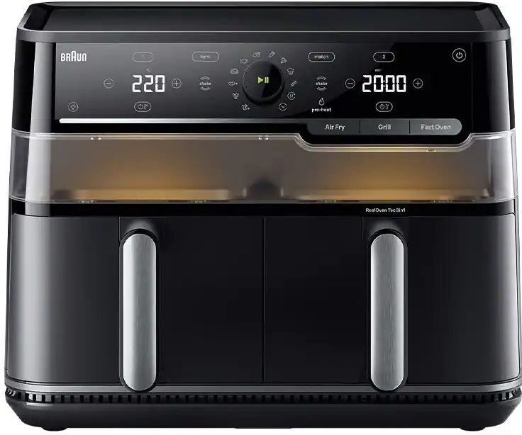 Frytkownice Frytkownica beztłuszczowa TwinCook 5 2 w 1 TD 5053I, czarna TwinCook 5 Opis produktu Podwój ilość smakołyków. Więcej sposobów gotowania, nieskończone kombinacje. Odkryj świat pełen smaku z TwinCook. To coś więcej niż frytkownica beztłuszczowa – to także osobisty grill i szybki piekarnik, pomagający przygotować wszystko, od ryb i mięsa po świeże warzywa i desery. RealOven Tec 2w1 i 3w1 wykorzystuje podwójne elementy grzewcze*, aby zapewnić idealnie chrupiące rezultaty w rekordowym czasie. W dwóch wyjątkowo dużych szufladach o pojemności 5 l można jednocześnie przygotować danie główne i przystawkę. Wyobraź sobie soczystego kurczaka o wadze 1,4 kg w jednej szufladzie i 1,2 kg chrupiących frytek w drugiej – oba będą gotowe dokładnie w tym samym czasie. * Tylko w prawej szufladzie. Najważniejsze cechy Urządzenie 2w1 Air Fry i Fast Oven: twórz jeszcze więcej przepisów dzięki 2 funkcjom. Niezależnie od tego,czy przygotowujesz chrupiące frytki,pieczesz warzywa lub ciasto – TwinCook 5 poradzi sobie z tym wszystkim dzięki 2 funkcjom w prawej szufladzie i 1 funkcji w lewej. Zdrowy sposób na chrupkość. RealOven Tec umożliwia rozprowadzanie ciepła na wyższym poziomie dzięki podwójnym elementom grzewczym:jeden znajduje się nad żywnością,a drugi pod nią. Ciesz się bardziej chrupiącymi potrawami bez konieczności nagrzewania piekarnika. Miej oko na swoje jedzenie Sprawdź postępy w przygotowaniu jedzenia jednym rzutem oka, bez zatrzymywania pracy lub otwierania frytkownicy. Panoramiczne okienko ze światłem oszczędza czas i utrzymuje ciepło wewnątrz, zapewniając równomierne, pyszne rezultaty za każdym razem. Kompletne posiłki dla całej rodziny Dwie bardzo duże szuflady o pojemności 5 l umożliwiają gotowanie dla całej rodziny: przygotuj całego kurczaka o wadze 1,4 kg oraz 1,2 kg frytek jednocześnie. Najważniejsze cechy Urządzenie 3 w 1 (Air Fry,Grill,FastOven) Smażenie gorącym powietrzem, grillowanie i FastOven: Przygotuj chrupiące frytki, opiecz warzywa, upiecz ciasto bądź zgrilluj kurczaka. Okienko panoramiczne Pojemność 10 l Dwie bardzo duże szuflady o pojemności 5 l umożliwiają gotowanie dla całej rodziny: przygotuj całego kurczaka o wadze 1,4 kg oraz 1,2 kg frytek jednocześnie. Funkcja dopasowania Szybkie rezultaty na wyciągnięcie ręki. Jeśli chcesz gotować to samo jedzenie w obu koszach, wystarczy nacisnąć przycisk, aby łatwo powielić ustawienia. Funkcja synchronizacji Nie musisz martwić się o różne czasy pieczenia – naciśnięcie przycisku Synchronizuj sprawia, że potrawy są gotowe w tym samym czasie. Części nadające się do mycia w zmywarce* Części nadające się do mycia w zmywarce* (*patrz instrukcja) Do 90% mniej tłuszczu* Ciesz się zdrowymi przepisami. Dzięki naszej technologii RealAir możesz uzyskać pyszny smak, który kochasz, używając minimalnej ilości oleju. *W porównaniu do ziemniaków smażonych w tradycyjnej frytkownicy. 20 automatycznych programów gotowania Wyeliminuj konieczność zgadywania i zwiększ różnorodność dań, które możesz łatwo przygotować. Dane techniczne Specyfikacja Możliwość mycia elementów w zmywarce*: Szuflada, ruszty numberOfFunctions: 3 Moc w watach (W): 2850 fastCooking technology: RealOven Technology