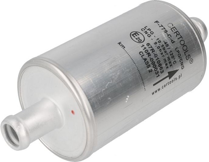 Opis produktu Filtr fazy lotnej model F-779-C-d firmy Certools. Zalecana wymiana wkładu co 20 000 km. Opis zastosowania Filtr fazy lotnej stosowany w układach czwartej generacji, sekwencyjnego wtrysku gazu w fazie lotnej, chroni listwę wtryskiwaczy przed zanieczyszczeniem i uszkodzeniem. Dane techniczne Aluminiowy jednorazowy filtr z wkładem z włókna szklanego. Króciec wejścia gazu o średnicy 14 milimetrów, króciec wyjścia gazu o średnicy 14 milimetrów, określony na obudowie kierunek przepływu gazu. Ciśnienie kwalifikacyjne 450 kPa, zakres zalecanej temperatury pracy od -40ᵒC do +120ᵒC. E20-67R-010663 E20-110R-000031 Cechy produktu Typ filtra: jednorazowy Wkład: włókno szklane Wejście: 14 mm Wyjście: 14 mm Obudowa: metal Sposób montażu: na przewodzie Informacje dodatkowe Kod produktu Nagaz: 32.CRT.535 Producent: CERTOOLS Kod producenta: 53-779-01414SJ Numer homologacji: E20-67R-010663