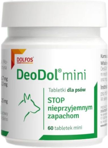 DeoDol mini - Neutralizuje nieprzyjemne zapachy Tabletki dla psw. Karma uzupeniajca. Waciwoci DeoDol mini zawiera starannie dobrane skadniki, ktre neutralizuj przykre zapachy, wydzielane przez psy oraz reguluj procesy trawienne.Chlorofil - naturalny, zielony barwnik rolin. Hamuje powstawanie nieprzyjemnych zapachw wydzielanych przez psy: zapach z pyska, zapach ciaa, zapach odchodw, "zapach cieczki". Chelat aminokwasowy cynku ma unikaln zdolno do czenia si ze zwizkami zawierajcymi siark (m. in. siarkowodorem) odpowiedzialnymi za przykry zapach. Ekstrakt Yucca Schidigera reguluje pasa treci pokarmowej, zmniejsza przykry zapach odchodw.Drode piwne - cenne rdo witamin z grupy B, reguluj procesy trawienne. Skad Skad tabletki mini Chlorofil 6,7 mg, Cynk z chelatu 3,3 mg, Extract Yucca Schidigera 25 mg, drode piwne, ekstrakt z jukka Mojave (Yucca Schidigera) Skadniki analityczne Biako surowe 14,2%, Oleje i tuszcze surowe 0,5%, Popi surowy 15,8%, Wkno