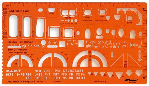Szablon Architektoniczny skala 1:50 10304 Leniar Szablon o grubości ok 1,2 mm z super elastycznego przezroczystego tworzywa w kolorze pomarańczowym posiada wypustki, które unoszą szablon ponad powierzchnię rysunku. W szablonie znajdują się otwory z symbolami architektonicznymi. Zawiera kształty takie jak elementy sanitarne i umeblowania pomieszczeń, instalacji elektrycznej, zakresy otwierania drzwi itp. Szablon dostosowany do pisaków technicznych, rapidografów oraz ołówków automatycznych o grubości 0.35 mm. Cechy produktu: rozmiar : 225 x 125 x 1.2 mm skala 1:50 elastyczne tworzywo grubości 1,2 mm do pisaków i ołówków 0.35 mm