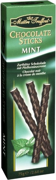 Chocolate Sticks - Mint to przepyszne pałeczki czekoladowe z wypełnieniem o smaku miętowym. Pałeczki są idealnym dodatkiem do kawy jak również świetną przekąską w ciągu dnia. Zawartość nadzienia miętowego w każdym paluszku wynosi 50%. Masa kakaowa czekolady gorzkiej: minimum 49%. Produkt posiada oznaczenie fair trade. Wyprodukowano w Niemczech w ramach marki Maitre Truffout z najlepszej czekolady! Zawartość netto: 75g