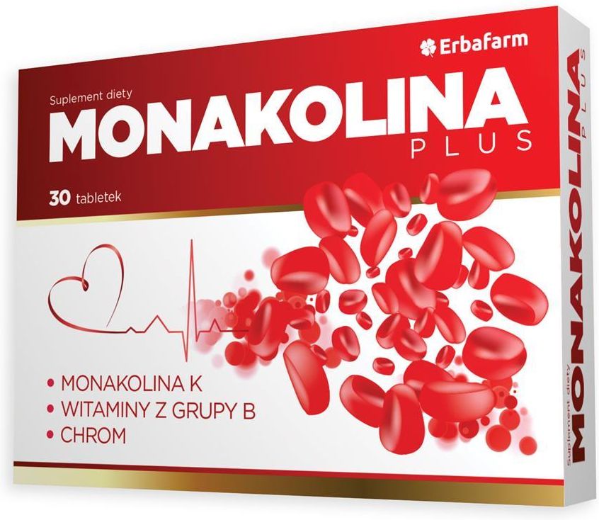 Monakolina PLUS Suplement diety Opakowanie 30 tabletek Przeznaczenie Dla osób dorosłych o podwyższonym poziomie cholesterolu. Właściwości Monakolina zawiera w swoim składzie unikalną kombinacje ekstraktu z czerwonych drożdży ryżu oraz witaminy B6, B12 i kwasu foliowego. Monakolina K to naturalna statyna, która pomaga w utrzymaniu prawidłowego poziomu cholesterolu we krwi. Witaminy B6, B12 oraz kwas foliowy dodatkowo wpływają na prawidłowy metabolizm homocysteiny w organizmie. Homocysteina uważana jest za niezależny czynnik rozwoju m.in.: zmian miażdżycowych, zawału mięśnia sercowego, udaru mózgu i zmian zakrzepowych. Dodatkowo Monakolina została wzbogacona o Chrom. Sposób użycia ¼ tabletki dziennie należy popić wodą. Należy przyjmować podczas lub po posiłku, najlepiej wieczorem. Nie należy przekraczać zalecanej do spożycia porcji w ciągu dnia. Zawiera 120 pojedynczych porcji produktu przeznaczonych do maksymalnego dziennego spożycia. Każda porcja zawiera 2,5 mg monakolin (1/4 tabletki). Składniki ekstrakt z fermentowanego czerwonego ryżu zawierający monakolinę K; substancje wypełniające: celuloza, fosforany wapnia, sorbitol; substancje przeciwzbrylające: dwutlenek krzemu, sole magnezowe kwasów tłuszczowych; witamina B12 (cyjanokobalamina); witamina B6 (chlorowodorek pirydoksyny); tiamina (monoazotan tiaminy); kwas foliowy (kwas pteroilomonoglutaminowy); chrom (chlorek chromu(III)). Składniki odżywcze, Zawartość w 1 tabletce, %RWS* Ekstrakt z fermentowanego czerwonego ryżu: 250mg w tym Monakolina K, 10mg, – Witamina B6; 1,4mg, 100%Tiamina; 1,1; 100% Witamina B12; 2,5µg, 100% Kwas foliowy, 200µg, 100% Chrom, 24µg, 60% Ostrzeżenia dotyczące stosowania: Nie spożywać dziennej ilości równej lub wyższej niż 3 mg monakolin ze sfermentowanego czerwonego ryżu. Niniejszy produkt nie powinien być spożywany przez kobiety w ciąży lub kobiety karmiące piersią, dzieci w wieku poniżej 18 lat i osoby dorosłe w wieku powyżej 70 lat. Należy zwrócić się o poradę do lekarza w sprawie spożycia tego produktu w przypadku wystąpienia jakichkolwiek problemów zdrowotnych. Nie można stosować preparatu w przypadku uczulenia (nadwrażliwości) na którykolwiek składnik preparatu. Stosowanie preparatu jest przeciwskazane w ciąży i w okresie karmienia piersią. Przed rozpoczęciem stosowania produktu zawierającego monakolinę K należy skonsultować się z lekarzem i określić poziom cholesterolu we krwi. Należy skonsultować się z lekarzem w przypadku stosowania długotrwale jakichkolwiek leków. Nie stosować jednocześnie z lekami obniżającymi stężenie cholesterolu i innymi lekami hipolipemizującymi. Nie można stosować preparatu jeżeli występuje: czynna choroba wątroby lub utrzymujące się zwiększenie aktywności aminotransferaz (enzymów wątrobowych) we krwi, ciężka niewydolność nerek, miopatia (choroby mięśni), utrudniony odpływ żółci (cholestaza). W czasie stosowania produktu nie należy spożywać soku grejpfrutowego. Produkt przeznaczony dla osób dorosłych. Nie należy stosować suplementu diety po upływie daty minimalnej trwałości. Zalecany jest zrównoważony sposób żywienia i zdrowy tryb życia. Preparat nie może być stosowany jako substytut (zamiennik) zróżnicowanej diety. Warunki przechowywania: Przechowywać w suchym miejscu, w temperaturze pokojowej. Chronić od światła. Przechowywać w sposób niedostępny dla małych dzieci. Podmiot odpowiedzialny ERBAFARM NATURALE Sp. z o.o. Piłsudskiego 143 92-332 Łódź