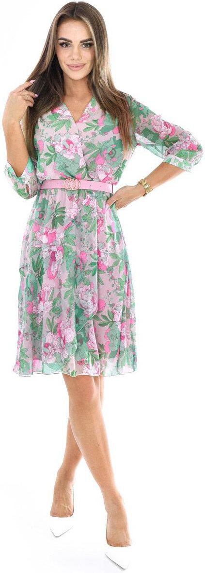 Sukienka FSU1098 RÓŻOWY zielono czerwone kwiaty różowy szyfon Łagów