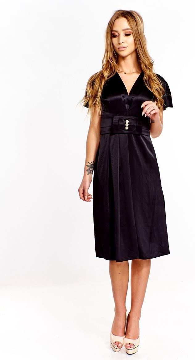 Fason: rozkloszowana, odcięta w pasie Dekolt przód: szpic Plecy: zabudowane Zapięcie: suwak kryty z boku Materiał: tkanina - satyna Długość całkowita: midi Rękaw: krótki, kimono Ozdoby: guziki