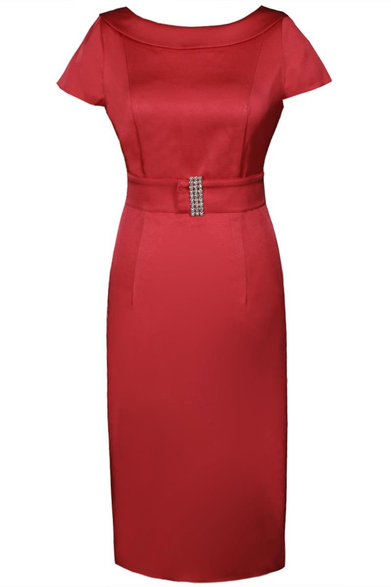 Fason: prosta, pęknięcie z tyłu Dekolt przód: efektowny kołnierz Plecy: dekolt szpic Zapięcie: suwak kryty z tyłu Materiał: tkanina - satyna Długość całkowita: midi Rękaw: krótki Ozdoby: pasek, klamra