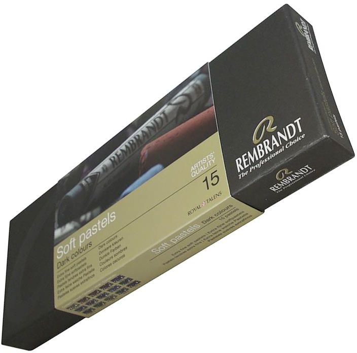 Talens Rembrandt Pastels Dark pastele suche zestaw zawiera:15 kol ciemnych Blue Green 640.2, Blue Violet 548.2, Cinnabar Green Deep 627.2, Indian Red 347.2, Olive Green 620.2, Orange 235.2, Permanent Red 372.2, Prussian Blue 508.2, Raw Sienna 234.2, Raw Umber 408.2, Red Violet 545.2, Turquoise Blue, 522.2, Ultramarine Deep 506.2, Violet 536.2 Yellow Ochre 227.2. opakowanie: estetyczna kaseta produkt holenderskiej firmy Talens