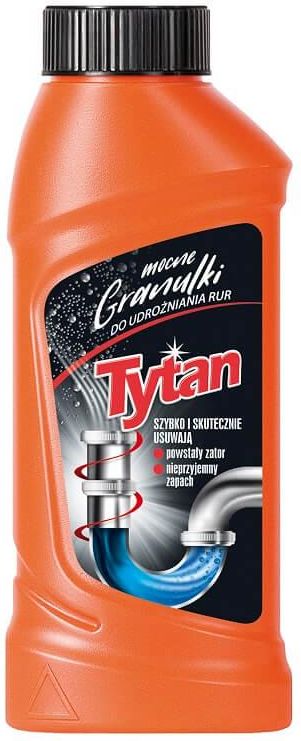 TYTAN Granulki do udrożniania rur przy zlewozmywakach, umywalkach, wannach oraz innych instalacjach odpływowych Granulki do udrożniania rur Tytan są przeznaczone do udrożniania rur przy zlewozmywakach, umywalkach, wannach oraz innych instalacjach odpływowych. Powodują rozpuszczanie odpadów kuchennych, włosów, zalegających tłuszczów, papierów itd. Pozostawiają świeży zapach. Nie zaleca się używać ich do aluminium. Największą zaletą granulek do udrażniania rur jest ich wysoka skuteczność. Radzą sobie doskonale nawet z poważnymi zatorami w naszych rurach. Usuwają włosy, tłuszcz i innego rodzaju odpadki. Ponadto działa grzybobójczo i bakteriobójczo. Zazwyczaj wystarczy jedna bądź dwie aplikacje by zażegnać problem. Musimy jednak pamiętać o tym, że jest to środek niezwykle ekspansywny i żrący. Dlatego też podczas jego użytkowania powinniśmy zachować odpowiednie środki ostrożności. Granulki Tytan są skutecznym i łatwym w użyciu środkiem do udrożnienia rur i syfonów. Nie są jednak na tyle cudownym środkiem by wyeliminować okresowe czyszczenie manualne syfonów odpływowych i kratek. Aczkolwiek można będzie robić to rzadziej dzięki naszemu środkowi. Jeśli zaś chodzi o oczyszczanie samego przepływu rur to granulki są nieprzecenione i bezwzględne dla zanieczyszczeń. Granulki do udrożniania rur Tytan – działanie i sposób użycia Granulki do udrożniania rur Tytan są środkiem silniejszym niż żele dedykowane do tych celów. Nie zapomnijmy o stosowaniu rękawic ochronnych, ponieważ kontakt ze skórą może być niebezpieczny. Samo użycie środka jest proste. Wsypać do syfonu ostrożnie 2-3 nakrętki preparatu i wlać następnie około 0,3l letniej wody. Po upływie co najmniej 10 minut spłukać wodą. W razie potrzeby czynność powtórzyć. Opróżnione opakowanie należy dokładnie wypłukać wodą, którą zużyć tak jak preparat.