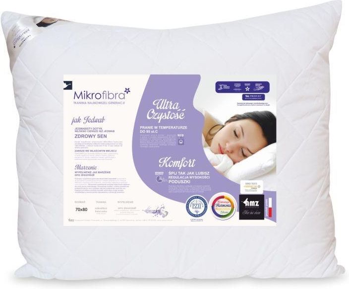 Poduszka pikowana Mikrofibra + Poduszka pikowana polskiej produkcji AMZ MIKROFIBRA to odpowiedni wybór dla alergików. Wypełniona w środku włóknem AMZ DREAMFILL o właściwościach antyalergicznych, co zapewnia zdrowy i efektywny sen. Z kolei powierzchnia poduszki została wyprodukowana z nowoczesnej tkaniny stworzonej w mikrotechnologii. Dzięki temu produkt jest niezwykle higieniczny i łatwy do utrzymania w czystości - poduszka z mikrofibry nadaje się do prania w temperaturze nawet 95 stopni C. Podstawą leczenia alergii jest unikanie alergenów. Badania pokazały, że na poliestrze roztocza kurzu domowego nie rozmnażają się, dlatego poduszki z wypełnieniem poliestrowym są skutecznym środkiem zapobiegającym kontakcie z tym alergenem. Stosowanie takich poduszek może wspomagać zapobieganie i łagodzenie alergii, takich jak przewlekły nieżyt nosa, astma, atopowe zapalenie skóry oraz inne choroby alergiczne, jako część działań zmniejszających ekspozycję na alergeny. Dlaczego warto wybrać poduszkę pikowaną Mikrofibra +? nowoczesna tkanina Mikrofibra, jedwabista w dotyku i jednocześnie wyjątkowo trwała, ✔ idealna dla osób ze skłonnością do alergii, ✔ wyrób medyczny, ✔ posiada zamek błyskawiczny umożliwiający regulację wysokości oraz twardości, ✔ wypełnienie opracowane przez technologów AMZ DREAMFILL, ✔ możliwość prania w temp. do 95oC. Wypełnienie poduszki Mikrofibra pikowana + Wypełnienie poduszki AMZ Mikrofibra pikowana + to włókno AMZ Dreamfill specjalnie opracowane przez technologów AMZ. Odpowiednio dobrana długość oraz grubość wydrążonych, karbikowanych włókien poliestrowych zapewnia lekkość oraz sprężystość. Włókno posiada bardzo dobry współczynnik termoizolacji zapewniając ciepło przy zachowaniu niskiej wagi wyrobu. Natomiast optymalna cyrkulacja powietrza pozwala ciału oddychać i optymalizować temperaturę podczas snu. Kołdry wypełnione są włókniną w postaci jednolitego płata. Włókna są bezpieczne dla alergików oraz szybkoschnące ułatwiając utrzymanie higieny. Tkanina poduszki Mikrofibra pikowana + Poduszka antyalergiczna z kolekcji Mikrofibra jest uszyta z pikówki trójwarstwowej (tkanina pokryciowa, włóknina, wigofil). Wyrób antyalergiczny wyprodukowany z najwyższej jakości materiałów, które zapewniają odpowiednią cyrkulację powietrza oraz optymalny poziom wilgotności. Najwyższej jakości bardzo gęste tkaniny, ultra czyste wypełnienie oraz nowoczesne metody produkcji zapewniają niesprzyjające warunki do rozwoju roztoczy oraz innych drobnoustrojów. Pielęgnacja poduszki Mikrofibra pikowana + Możliwość prania w pralce w warunkach domowych oraz szybkie schnięcie wyrobów pozwala łatwo zachować go w czystości. A maksymalna dozwolona temperatura prania 95 st. C pozwala na wyeliminowanie roztoczy oraz innych drobnoustrojów. Suszyć w stanie rozwieszonym. Dopuszczalne suszenie w suszarce bębnowej w temperaturze max. 60 °C. Dopuszczalne wirowanie na niskich obrotach (max 400 obr/min). Przed przystąpieniem do używania wyrobów, należy uważnie zapoznać się z ich instrukcjami używania. Instrukcje przekazane są w celu poinformowania o prawidłowym użytkowaniu wyrobów. Produkty należy stosować zgodnie ze wszystkimi informacjami zawartymi w ich instrukcjach. W przypadku wątpliwości dotyczących zastosowania wyrobów oraz w każdym przypadku podejrzenia chorób alergicznych należy skonsultować się z lekarzem. Zobacz instrukcje użytkowania Certyfikaty Certyfikat OEKO-TEX - od 1992 roku Oeko-Tex® Standard 100 jest wiodącym w świecie znakiem bezpieczeństwa wyrobów włókienniczych. Produkty, którym przyznano ten znak, są wolne od substancji szkodliwych w stężeniach mających negatywny wpływ na stan zdrowia człowieka m.in. pestycydów, chlorofenoli, formaldehydu, barwników alergizujących, zabronionych barwników azowych i ekstrahowalnych metali ciężkich. Rozmiar i ilość wypełnienia poduszki Mikrofibra pikowana + Rozmiar 40x40cm: wypełnienie - 250g ✔ Rozmiar 40x60cm: wypełnienie - 350g ✔ Rozmiar 50x60cm: wypełnienie - 550g ✔ Rozmiar 50x70cm: wypełnienie - 650g ✔ Rozmiar 70x80cm: wypełnienie - 1200g ✔Ze względu na specyfikę produktów podane wymiary są wymiarami poglądowymi i mogą się nieznacznie różnić od rzeczywistych wymiarów.