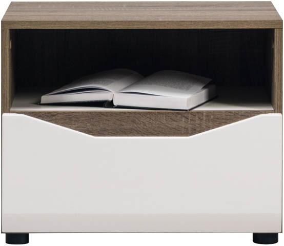 Szafka nocna LIONEL LI-13 posiada jedną szafkę oraz szufladę. Szafka nocna LIONEL jest idealnym dopełnieniem łóżka. To cicha nocna bohaterka, pilnująca by książka, budzik i szklanka wody zawsze była w zasięgu ręki. System LIONEL onieśmiela swą nowoczesnością. Połączenie białego dekoru wraz z dębem sonoma truflowym stanowi najsilniejszy punkt kolekcji LIONEL. Oryginalna forma, futurystyczne wzornictwo tworzy niezastąpioną kolaborację z frontami wykonanymi z płyty MDF oklejonej folią PCV z podfrezowaniami tworzącymi wygodne uchwyty. Korpusy zostały wykonane z wysokiej jakości płyty wiórowej laminowanej odpornej na zabrudzenia oraz zarysowania. Prowadnice szuflad są zintegrowane z systemem hamowania, zaś hamulce do drzwi zostały zamontowane w zawiasach. Stonowany design kolekcji LIONEL sprawia, że system doskonale wpasowuje się w każde wnętrze.Produkt posiada wiele wariantów.