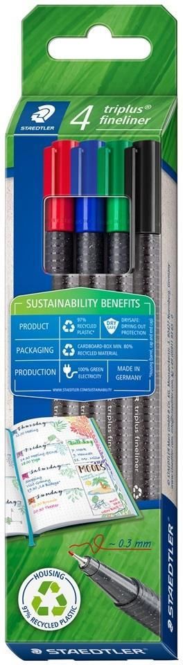 Fineliner triplus, kartonowe et ui- Etui wykonane w 97% z plastiku pochodzącego z recyklingu zgodnie z normą ISO 14021- z bardzo cienką, metalową końcówką- ergonomiczny trójkątny korpus ułatwia pisanie bez zmęczenia- BEZPIECZNY NA SUCHO - może pozostawać otwarty przez wiele dni bez wysychania- można wyprać z większości tekstyliów- z klipsem- Tusz na bazie wody- Srebrny korpus / skuwka i końcówka w kolorze linii- Szerokość linii: ok. 0,3 mm- dostępne w kolorach czerwonym, niebieskim, zielonym i czarnym STAEDTLER Fineliner triplus zestaw 4 sztuk detalicznych - Do swobodnego pisania. Bezpieczny w samolocie - automatyczne wyrównywanie ciśnienia zapobiega wyciekaniu pióra w samolocie. Szerokość linii: 0,3 mm Kolor pisania: czerwony - niebieski - zielony - czarny Okrągła końcówka 4 szt. w opakowaniu. Zestaw 4 cienkopisów w przyjaznym dla środowiska kartonowym pudełku. Ergonomiczny, trójkątny korpus zapewnia wygodę pisania. BEZPIECZNE NA SUCHO: mogą być przechowywane przez kilka dni bez skuwki i nie wysychają. Cienka końcówka 0,3 mm. EAN: 4007817099971 Głębokość: 14.000000 ISBN: 4007817099971 Typ: Artykuły papiernicze Szerokość: 50 Wydawca: Staedtler Wysokość: 207 Zestaw 4 cienkopisów w kartonowym ekologicznym opakowaniu. Ergonomiczna obudowa w kształcie trójkąta zapewnia komfort pisania. DRY SAFE: można zostawić bez skuwki na kilka dni i nie wyschnie. Cienka końcówka 0,3 mm.