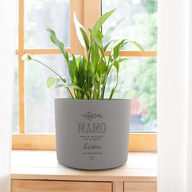 Solidna i stabilna doniczka ceramiczna to idealny prezent dla mamy. Wykonana z wysokiej jakości, polskich materiałów. Posiada ciekawy, personalizowany wzór wykonany za pomocą graweru. Takim prezentem sprawisz mamie ogromną radość. Parametry ceramiczna osłonka na doniczkę solidna i stabilna nie posiada otworów średnica: 17 cm wysokość: 14 cm kolor: szary waga: ok. 1,4 kg personalizacja wykonana za pomocą graweru produkt polski Uwaga! Kwiaty przedstawione na zdjęciu są tylko elementem dekoracyjnym. Przedmiotem sprzedaży jest sama doniczka. Personalizacja Aby w pełni spersonalizować produkt, prosimy o przesłanie potrzebnych danych na adres email, a nasi graficy zajmą się resztą :)