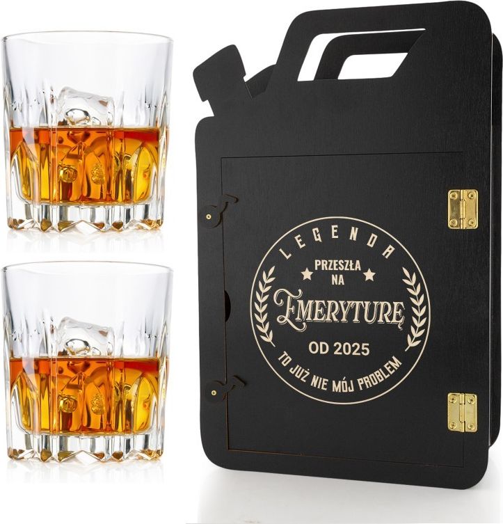 Życie po pracy wcale nie musi być nudne! Ten kanister nie tylko świetnie wygląda, ale i kryje w sobie wyjątkowy charakter – w końcu kto powiedział, że emerytura to koniec zabawy? Z tym barkiem w kształcie kanistra, emeryt staje się prawdziwą legendą – gotowy na każdą imprezę, od "niedzielnego relaksu" po "coś mocniejszego po obiedzie". Grawer podkreśla, że życie dopiero teraz nabiera smaku – a z dwoma szklankami w komplecie, każda chwila staje się okazją do toastu. Bo prawdziwa legenda zasługuje na odpowiednią oprawę do swoich wieczornych ceremonii picia herbaty… albo czegoś bardziej mocnego, jeśli dzień naprawdę zasługuje na uczczenie! Parametry Kanister drewniany barek kanister wykonany ze sklejki drzwiczki zamykane na haczyki trzy półki na butelkę, szklanki lub puszki na drzwiczkach wykonamy grawer dedykacji grawer laserowy - gwarancja najwyższej jakości i trwałości wymiary: 11 x 25,5 x 40 cm kolor: czarny Szklanki liczba sztuk: 2 wysokość: 8,5 cm średnica górna szklanki: 8,7 cm pojemność: 300 ml kolekcja Karat najwyższej jakości szkło możliwość mycia w zmywarce Uwaga! Alkohol prezentowany na zdjęciach nie wchodzi w skład zestawu. Personalizacja Aby w pełni spersonalizować produkt, prosimy o przesłanie potrzebnych danych na adres email, a nasi graficy zajmą się resztą :)