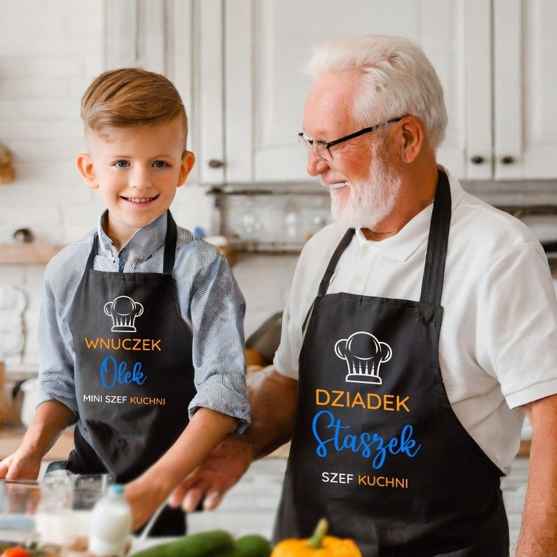 Fartuchy kuchenne dla dziadka i wnuka z nadrukiem to idealne rozwiązanie dla wszystkich pasjonatów gotowania i spędzania wspólnych chwil w kuchni. Ten zestaw nie tylko ochroni ubrania przed ewentualnymi plamami czy poparzeniami, ale również doda wyjątkowego charakteru i podkreśli pasję do gotowania. Fartuchy są odporne na zabrudzenia i zapewniają komfort noszenia. Parametry Fartuch męski wymiary: 65 x 90cm materiał: 100% bawełna kolor: czarny gramatura: ok. 180 g/m² prać ręcznie nadruk personalizacji wykonany metodą sublimacji Fartuch dziecięcy fartuch dziecięcy z regulacją długości klamra z regulacją na szyi paski do wiązania o długości 50 cm wymiary: 43 x 53 cm odpowiedni dla dzieci w wieku 3-6 lat materiał: 65% poliester, 35% bawełna kolor: czarny gramatura: ok. 195 g/m² kolorowy nadruk personalizacji Personalizacja Aby w pełni spersonalizować produkt, prosimy o przesłanie potrzebnych danych na adres email, a nasi graficy zajmą się resztą :)