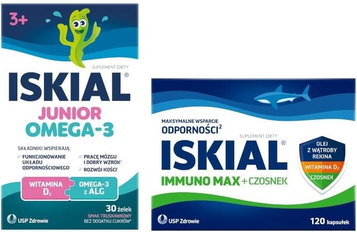 Zestaw zawiera: 1 x Iskial Immuno Max + Czosnek, 120 kapsułek 1 x Iskial Junior Omega-3 Żelki, 30 sztuk