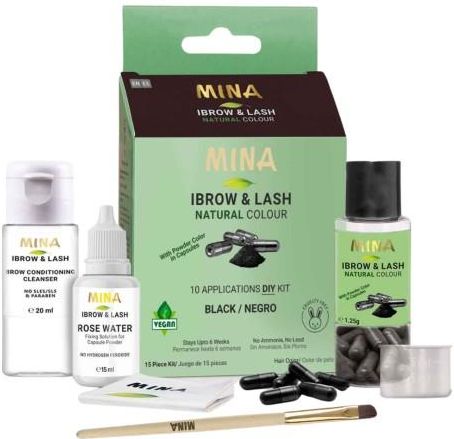 MINA IBROW&LASH CAPSULES Henna pudrowa do brwi i rzęs kapsułki Black MINA MINA IBROW&LASH KAPSUŁKI, to zestaw za pomocą którego wykonasz 10 zabiegów farbowania brwi lub rzęs henną pudrową Mina Ibrow Henna. Każdy z kolorów posiada neutralny odcień, tak aby zapewnić Tobie lub Twoim klientom naturalne, subtelne i efektowne brwi i rzęsy. Zestaw w kapsułkach dostępny jest w 5 kolorach: Ash Blonde, Laight Brown, Medium Brown, Dark Brown, Black. Zestaw zawiera 10 kapsułek z henna pudrową. Jedna kapsułka przeznaczona jest na jedną procedurę zabiegową. Mina Mleczko Oczyszczające 20ml. Mina Woda Różana – Aktywator do henny Akcesoria: miarkę, pędzelek do aplikacji henny. Zestaw "Mina IBrow & Lash Capsule" zawiera 10 kapsułek w jednym pudełku, które wystarczają do 6 tygodni. Mina Henna do brwi to produkt pochodzenia naturalnego, organicznego, przeznaczony do farbowania skóry i włosów brwi. Jest to półtrwała metoda pigmentowania. Mina Henna pudrowa farbuje włosy jednoczenie je odżywiając i pogrubiając. Koloryzuje również skórę, pozostawiając na niej subtelny odcień, w wybranym kolorze. W ten sposób zabieg farbowania uzupełnia ubytki, wizualnie je wypełnia tworząc efekt grubych, pełnych i gęstych brwi. Zalety Produkt oparty w całości na naturalnych składnikach. To bogactwo witamin i składników o działaniu odżywczym, dzięki którym nadaje kolor włosom i skórze, jednocześnie je pielęgnując. Bogaty w minerały i przeciwutleniacze. Przeznaczony do wszystkich typów skóry. Semi-permamentny pigment, odporny na rozmazywanie równomiernie farbuje skórę i włosy. Produkt nie zawiera: parabenów, SLS/SLES. Tworzy efekt tatuażu na skórze. Bez amoniaku, bez ołowiu. Opakowanie wystarcza na 30 zabiegów. Dostępny w 12 odcieniach. Składniki aktywne. Henna (Lawsonia Intermis). To naturalna henna, która nadaje włosom intensywny kolor. Oprócz efektu kolorystycznego doskonale pielęgnuje włosy, zwiększając ich objętość. Henna wnika w strukturę włosów, łącząc się z keratyną, dzięki czemu wzmacnia i wyraźnie je pogrubia. Proszek z liści aloesu (Aloe Barbadenis Leaf Powder). Działa nawilżająco, regenerująco i pielęgnująco na skórę. Ma właściwości kojące i łagodzące podrażniania. Olejek z nasion Jojoby (Simmondsia Chinensis Seed Oil). Odżywia i nawilża skórę i włosy. Zapobiega wypadaniu włosów i uzupełnia ich uszkodzenia. Sposób użycia Przygotuj skórę i włosy brwi używając Mina mleczka oczyszczającego. Wykonaj rysunek wstępny. Do załączonej w opakowaniu miarki, wsyp zawartość jednej kapsułki. Dodawaj aktywator (Mina woda różana) do momentu uzyskania konsystencji „gęstej śmietanki”. Mieszaj do uzyskania gładkiej, jednolitej konsystencji. Zaaplikuj Mina henna sugerując się wyznaczonym rysunkiem wstępnym. Aplikuj jedną, do dwóch warstw henny, zależności od intensywności koloru jaki chcesz uzyskać (im więcej warstw, tym ciemniejszy kolor). Po wyznaczonym czasie (ok. 15-20 min) i całkowitym zaschnięciu barwnika na brwiach, zmyj zaschnięte warstwy henny za pomocą mleczka oczyszczającego do brwi Mina. Mina iBrow henna to najbardziej innowacyjna henna pudrowa na rynku światowym. Produkowana jest w Indiach w rejonie Radżastan, gdzie ze względu na warunki klimatyczne uprawiana jest jej najlepsza jakościowo odmiana. Aby utrzymać najlepszą jakość i czystość henny, jednostkę przetwórczą założono na dziewiczych wzgórzach Himalajów w małych miasteczkach Shoghi i Shimla. Nazwa „Mina” pochodzi od popularnego w Egipcie, Indiach i Na Bliskim wschodzie imienia. Oznacza ono siłę, determinację, zaangażowanie – jego znaczenie pokazuje również ducha marki Mina iBrow Henna. Dzięki ponad dziesięcioletniemu doświadczeniu oraz wnikliwym badaniom Mina iBrow Henna stworzyła wyselekcjonowany produkt z mistrzowskimi efektami koloryzacji. Dzięki odpowiednio przygotowanej skórze i włosom oraz starannej aplikacji, efekt utrzymuje się do 6 tygodni na włosach oraz od 5 do 10 dni na skórze.