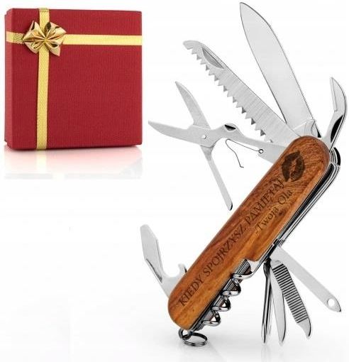 NÓŻ SCYZORYK SPLINTER SKŁADANY MULTITOOL GRAWER PREZENT na URODZINY 18-99 CO WYRÓŻNIA NASZ PRODUKT 1✔️Bogactwo różnorodnych funkcji, które zadowolą różne potrzeby użytkowników. Wyjątkowy design z indywidualnym grawerem i elegancką rękojeścią z drewna. Wysoka trwałość i bezpieczeństwo dzięki użyciu stali w konstrukcji narzędzi. GRATIS pudełko prezentowe, co sprawia, że jest gotowy do wręczenia jako prezent. NIEZWYKLE PRAKTYCZNY I ELEGANCKI! Prezentujemy Państwu nasz doskonałej jakości scyzoryk wielofunkcyjny z grawerem. Jego indywidualne i wyrafinowane funkcje, w tym m.in. nóż, piła, skrobak do ryb, nożyczki, otwieracz do puszek, otwieracz do butelek, śrubokręt, korkociąg, szydło, a także dziurkacz do skór zaspokoją różne potrzeby każdego mężczyzny, zapewniając pełne zadowolenie z użytkowania. DOSKONAŁY JAKO PREZENT! Nasz scyzoryk charakteryzuje się nie tylko praktycznością, ale i elegancją. Posiada drewnianą rękojeść, która dodaje mu szlachetności, a indywidualny grawer sprawia, że jest to prezent wyjątkowo osobisty. Co więcej, dodajemy do niego GRATIS pudełko prezentowe, aby podarunek był gotowy od ręki do wręczenia. WYTRZYMAŁOŚĆ I BEZPIECZEŃSTWO! Scyzoryk został wykonany z najwyższej jakości stali, co gwarantuje jego trwałość i odporność na uszkodzenia. Jego kompaktowe rozmiary i bezpieczny mechanizm składania dodają mu praktyczności i bezpieczeństwa podczas transportu. UNIKALNOŚĆ I INDYWIDUALNOŚĆ! Unikalny grawer na rękojeści sprawia, że ten produkt jest nie tylko praktyczny, ale także elegancki i indywidualny. Scyzoryk nie jest tylko narzędziem, ale także wyrażeniem stylu i klasy swojego właściciela. SPECYFIKACJA Stan: Nowy Okazja: Dzień Chłopaka Rodzaj gadżetu: niezbędnik Informacje dodatkowe: z grawerem Kod producenta: grawerowany scyzoryk prezent dla niego Marka: ePrezenty