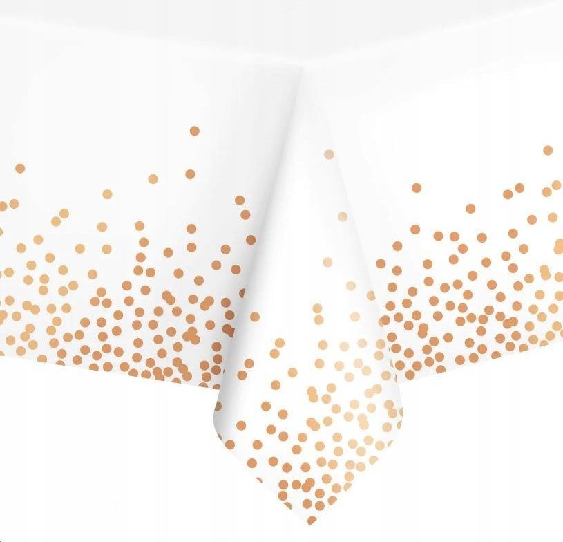 Foliowy obrus w kolorze białym z nadrukiem konfetti w kolorze rosegold. W łatwy i wygodny sposób pozwoli przygotować stół na każde przyjęcie. Łatwy w utrzymaniu czystości. Wymiary: 137 cm x 274 cm Ilość sztuk w opakowaniu: 1 szt.